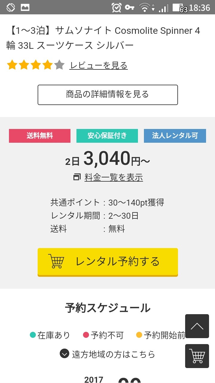 ちなみに気になる料金なんですが、例えば旅行カバンの名門サムソナイトのスーツケースが2日レンタル3040円から。さらに長く借りれば一日あたりの料金はもっとオトクに。