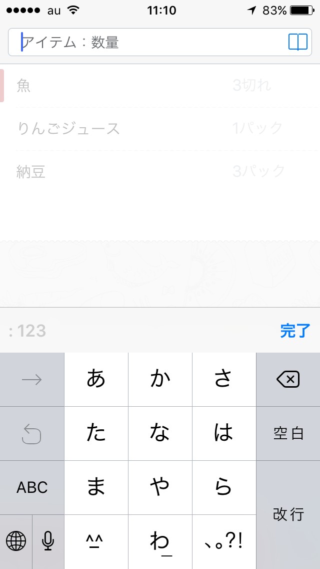 画面上部の「+新しいリスト」をタップし、画面上部の「+新商品」欄に買い物メモを追加します。「アイテムの名前」を入力し、画面中央の「:123」をタップして数量を入力しましょう。画面上に入力したリストが作成されますよ。同じ要領で買い物メモを追加しましょう。買い物リストは複数作成できます。お店ごと、日にちごとなどで作ってみると分かりやすいですよ。