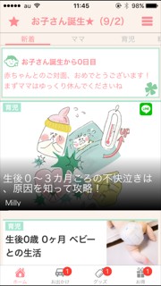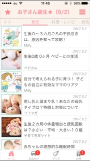 「ホーム」からは、最初に設定した自分の子どもの月齢に合わせた育児関連のニュースやお役立情報が配信されています。