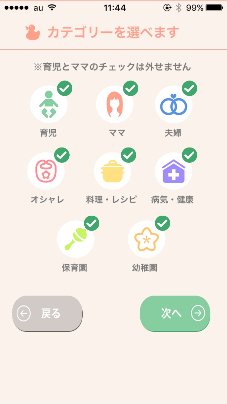設定の「記事カテゴリー設定」から配信されるニュース、記事の内容を選択できます。「育児」と「ママ」は外せませんが、その他の「夫婦」、「オシャレ」、「料理・レシピ」、「病気・健康」、「保育園」、「幼稚園」から不要なものは配信されないように設定できます。「保育園」と「幼稚園」は、自分の子どもが通うどちらかだけで十分というママも多そうですね。「お出かけ情報配信エリア」も東京都、神奈川県&都心、埼玉県&都心、大阪府、京都府、兵庫県南部&大阪都心、愛知県、福岡県、設定しないと選択することができます。それ以外のエリアについては、今後増えていく予定だそうです。東北、北海道のママにとっては、是非早めにエリアを追加して欲しいですね。