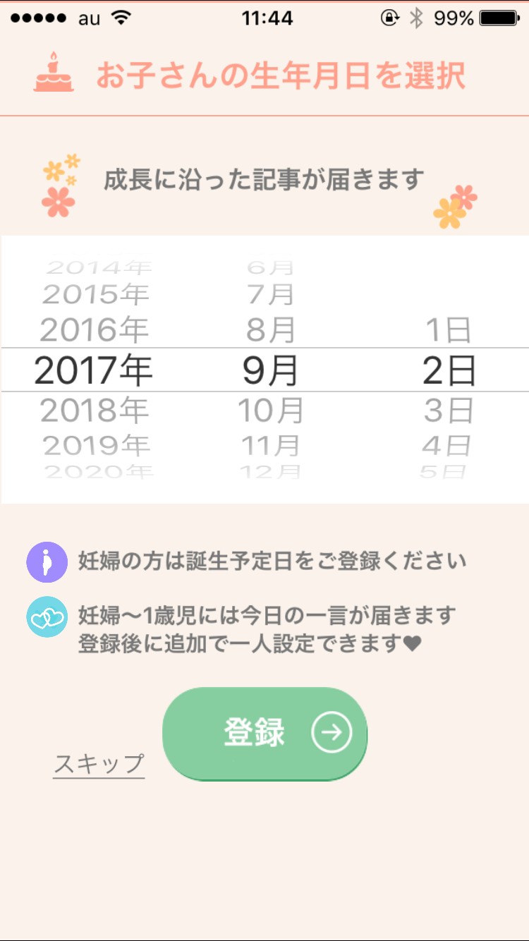 「ママタイムズ」をインストールすると、まずお子様の生年月日を登録します。これによって、その月齢にあった情報が配信されます。