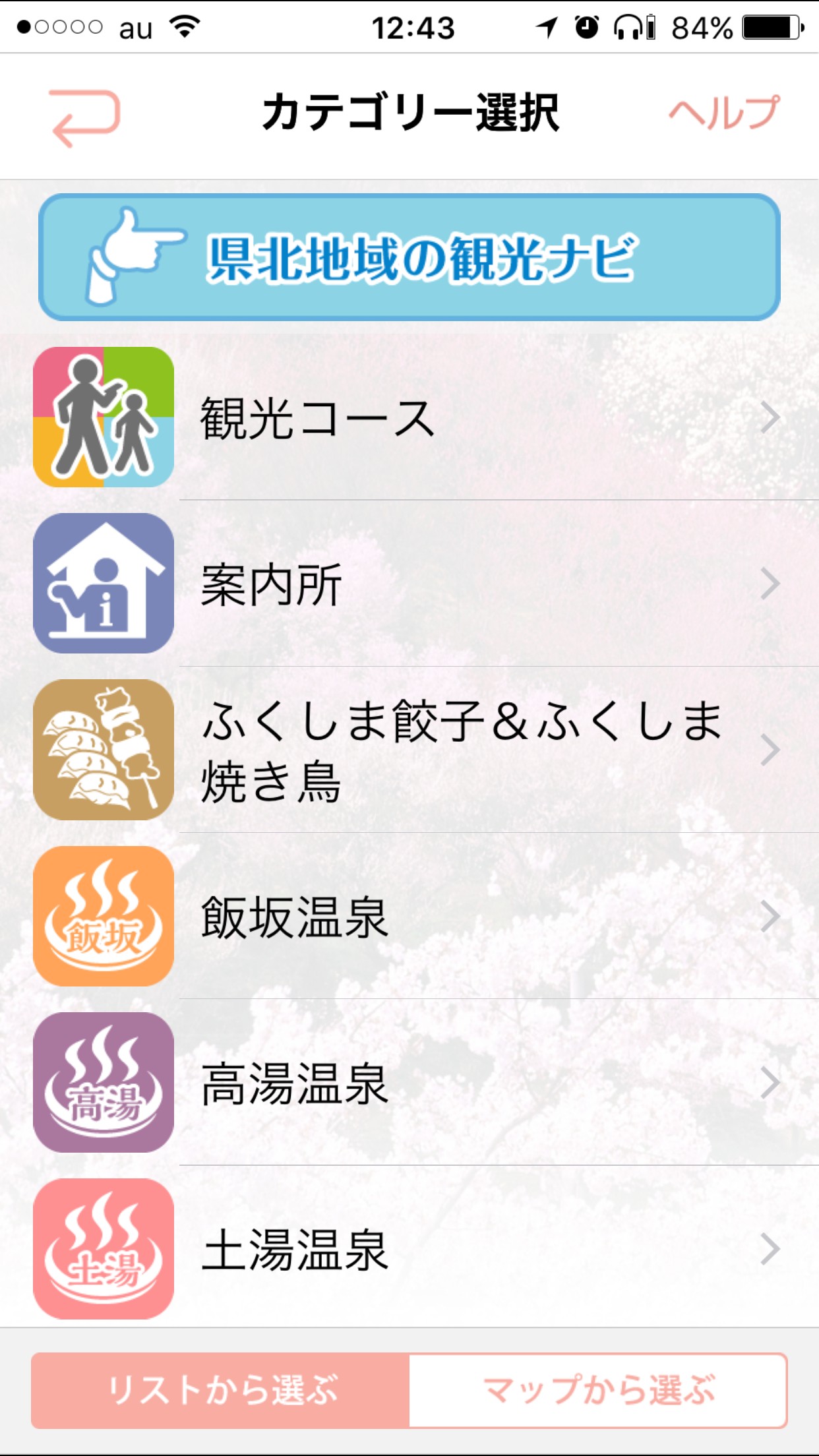 - アプリ下部にある”福島市の観光地リスト”をタップ