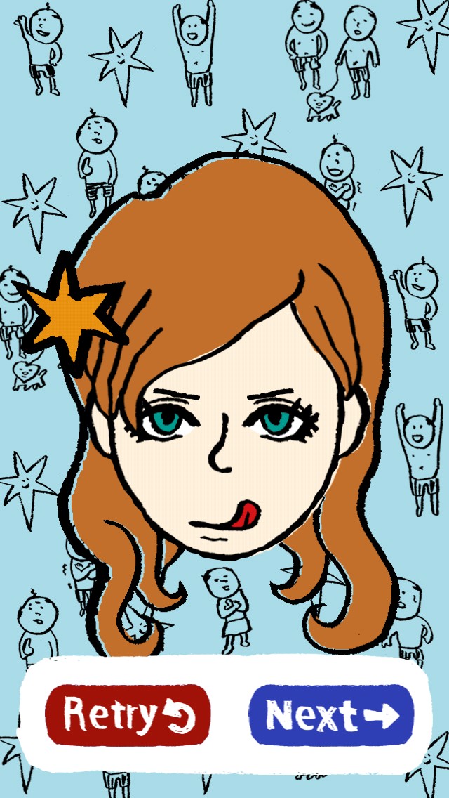 質問は全部で11個あり、性別や髪の長さなどの簡単な質問に答えるだけで似顔絵を自動作成してくれます。Retryをタップすると再度質問に答えてやり直せます。Nextをタップすると編集画面に移動し、編集が可能です。必要なければそのままOKをタップすると保存されます。