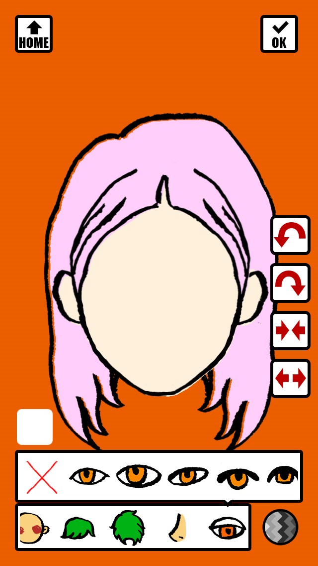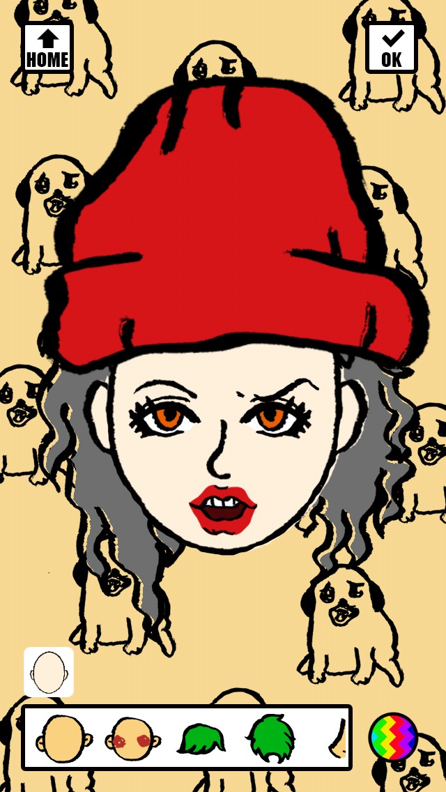 輪郭や髪型、顔の各パーツを選んで似顔絵を作っていきます。右下の丸いマークをタップするとカラーチェンジができるので髪や肌、帽子などのアイテムをお好みの色に変更してみてください。