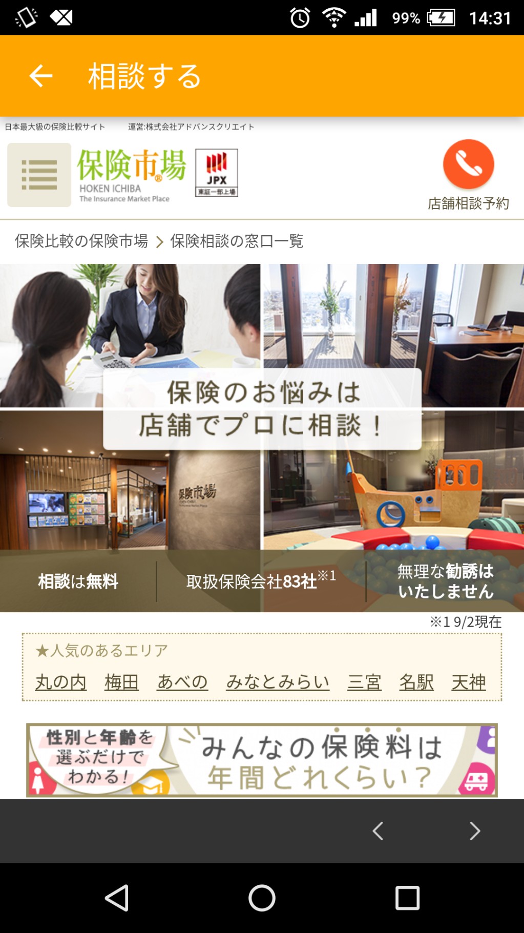 アプリから相談をする方法は簡単で、起動画面の「相談する」を選択し、近くの店舗をで検索して電話で予約を入れるだけです。アプリだけでは分からない不安を、実際の相談員と話すことで納得の保険見直しが行えます。