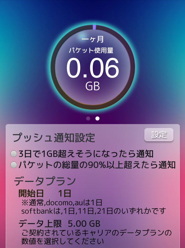 事前にアプリにある「パケット使用量」の画面でデータプランの開始日やデータ上限を設定しておくだけで簡単にパケット使用量の確認できますよ。