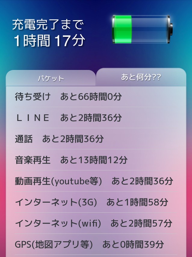 現在の電池残量で利用できる機能・サービス使用時間を知りたい場合には、電池残量画面にある「あと何分??」という項目よりLINEや通話、音楽再生、インターネットなど毎に使用可能時間が提示されます。