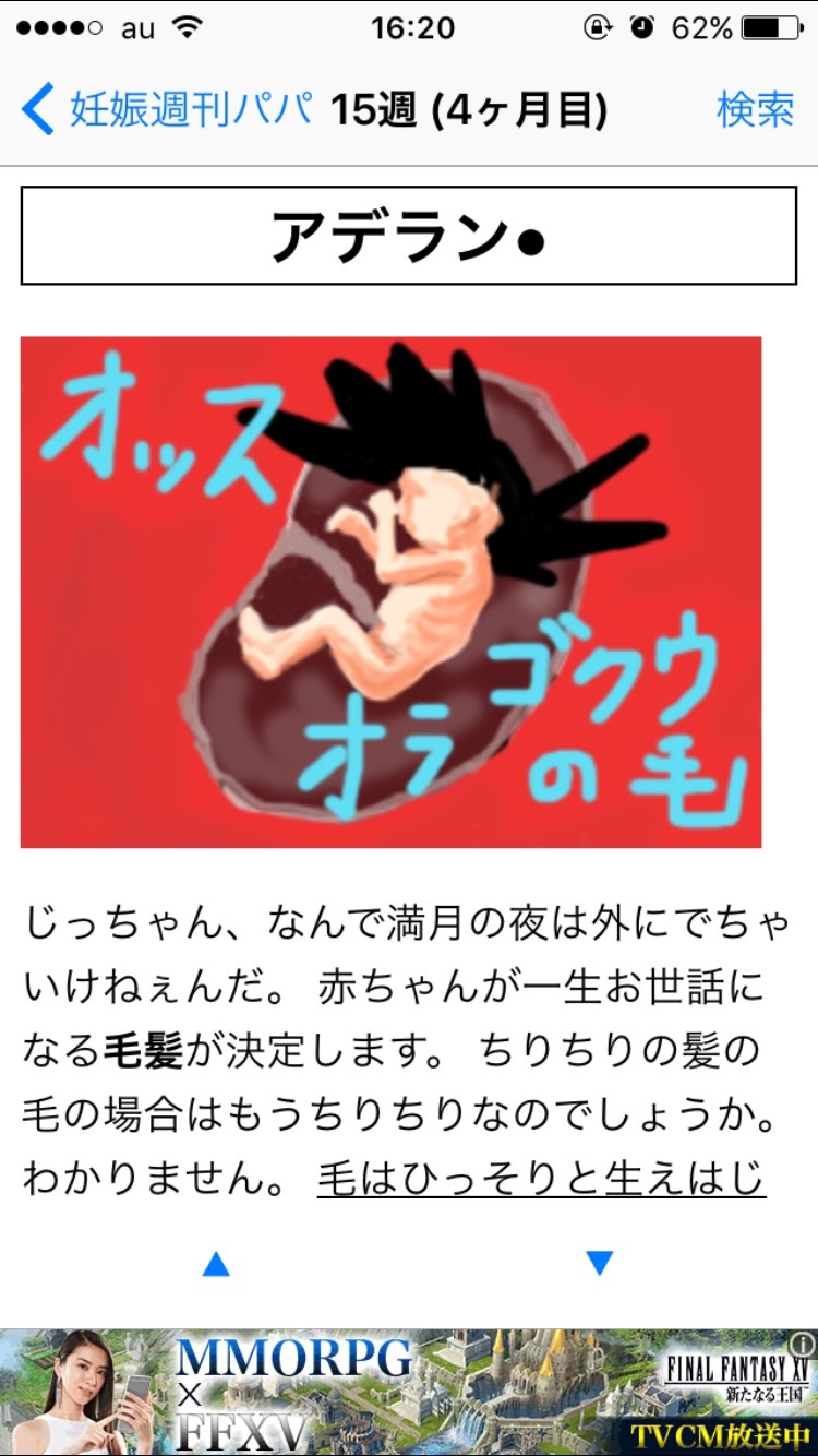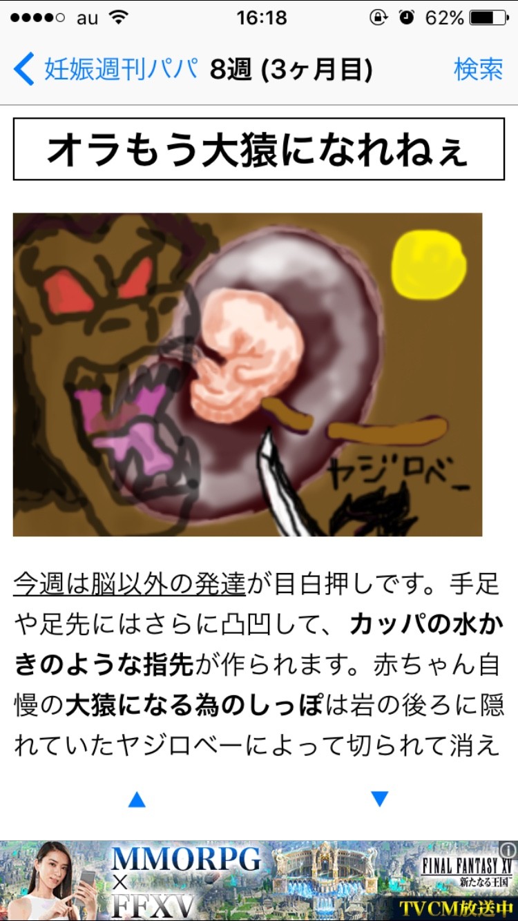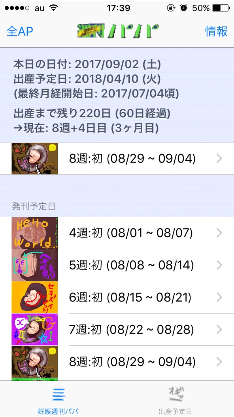 例えば出産予定日を4月10日に設定して妊娠週刊パパのタブの切り替えます。すると現在は8週目。40週までの解説を読むことができます。