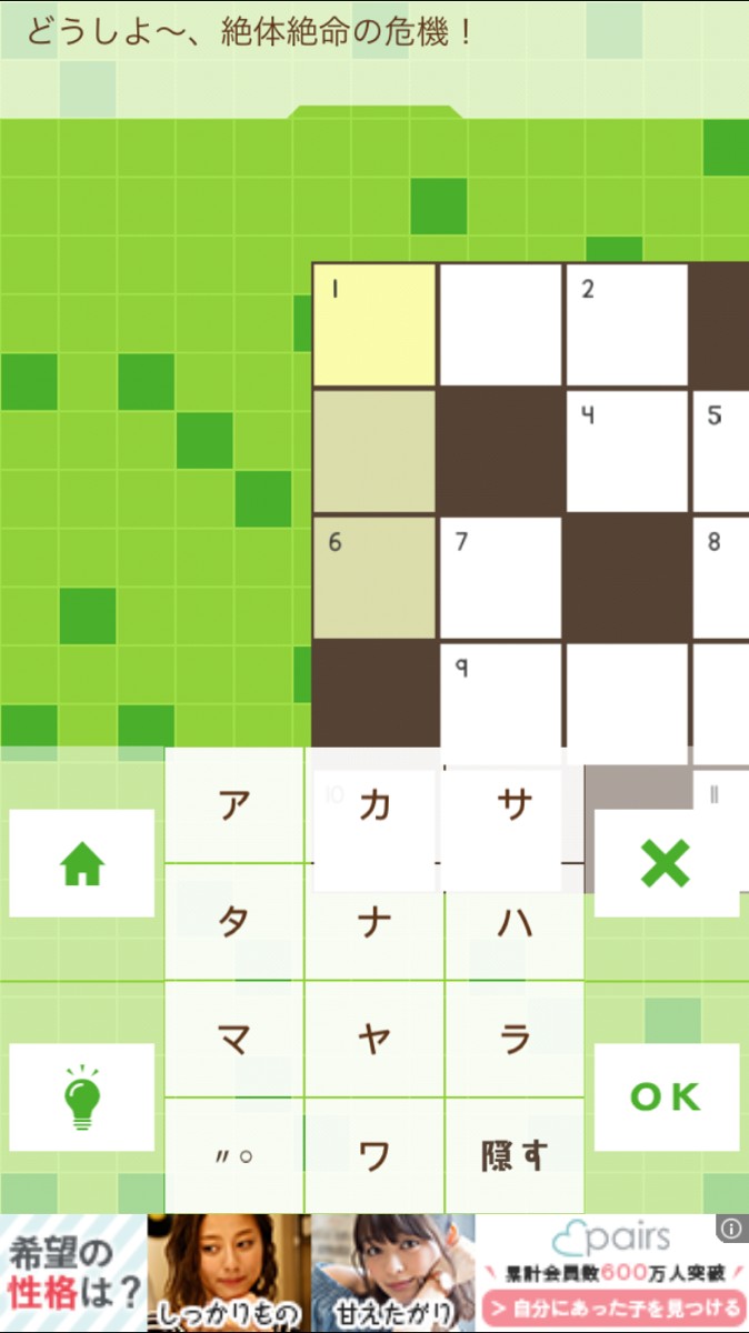 ホーム画面に入ったら、「クロスワードを解く」ボタンをタップします。初級の東京駅が表示されたら「問題を解く」をタップしてクロスワードを始めます。