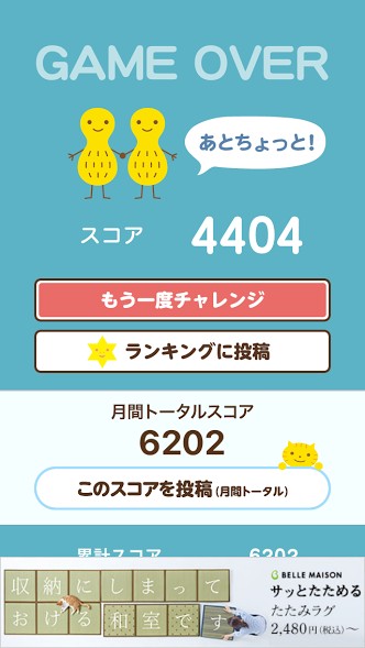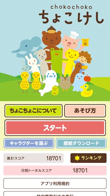 累計スコアを伸ばすことで、使えるちょこちょこキャラクター達も増えていくので、何度もチャレンジしたくなりますよ。