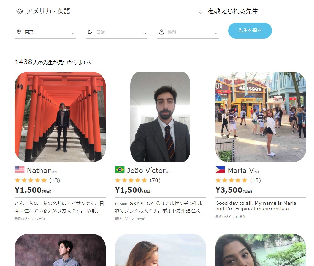 「flamingo」は、アプリを利用して外国の方とマッチングをし、カフェなどで語学交流ができるマッチングアプリです。英語の勉強がしたいときは、アプリ内で学びたい言語を選択するだけで、日本在住の英語を教えられる外国人が選出されます。その中から自分が習いたいと思った先生をセレクトし、予約を申請。その後、申請が承認されると支払いが自動的に終了し、あとは予約日にカフェで待ち合わせてレッスンを受ける流れになっています。「flamingo」の良いところは、先生と都合さえ合えば休日でもレッスンが受けられるところでしょう。そのため、仕事が終わった後にレッスンを受けなくても、休日に予約をとれば、余裕を持ってレッスンを受けることができます。また、予約はアプリやウェブ上で簡単にできるので、休憩や通勤時の隙間時間を利用すれば効率よく予約作業をすることが可能です。先生のプロフィールには、日本語能力がどれだけあるのかといった情報や、主なレッスン地域などが載っているので、気になる先生が見つかった場合は、細かいところまでチェックしてみましょう。人気のある先生になると、レッスン料金が高かったり予約が取りにくかったりするので、予約の取りやすい先生や、自分に合う先生を見つけるのも楽しいかもしれません。