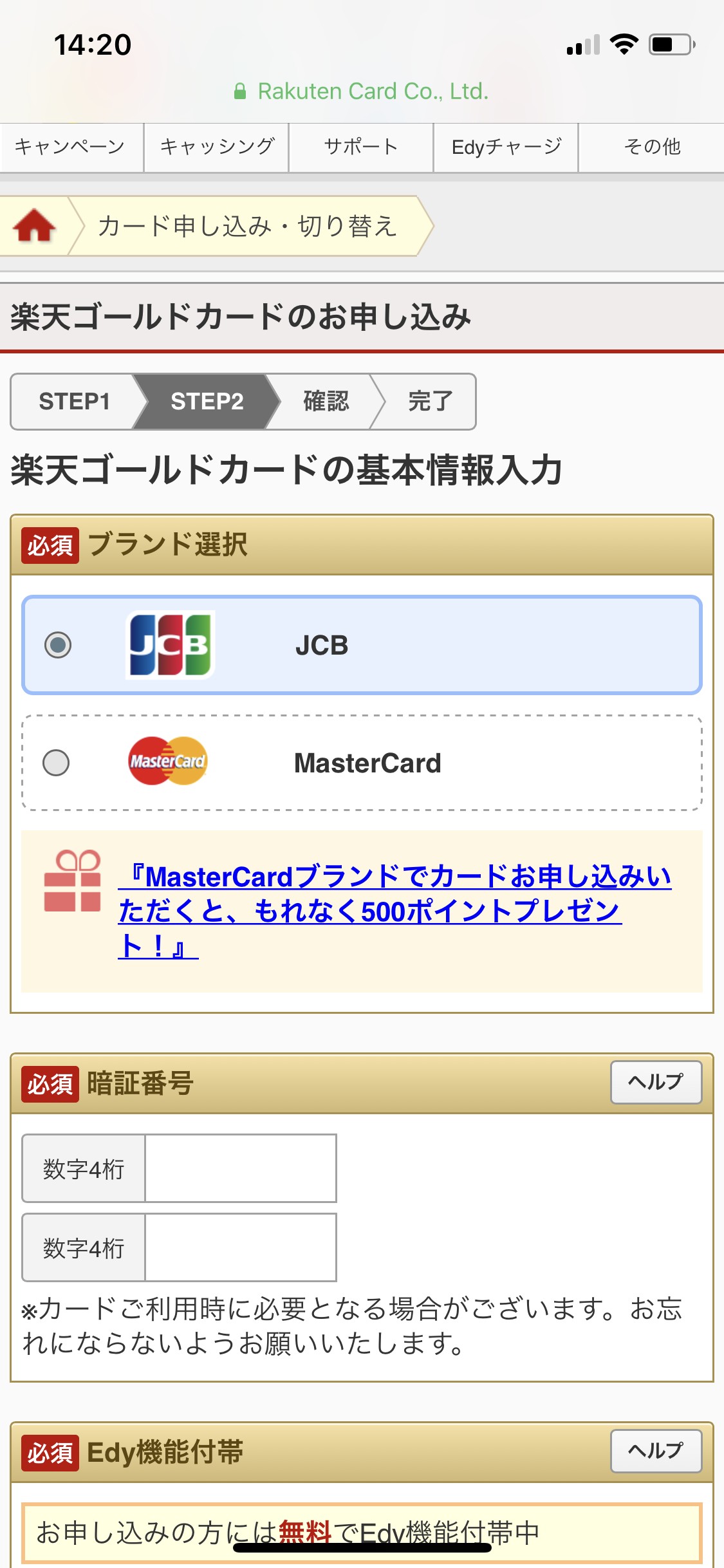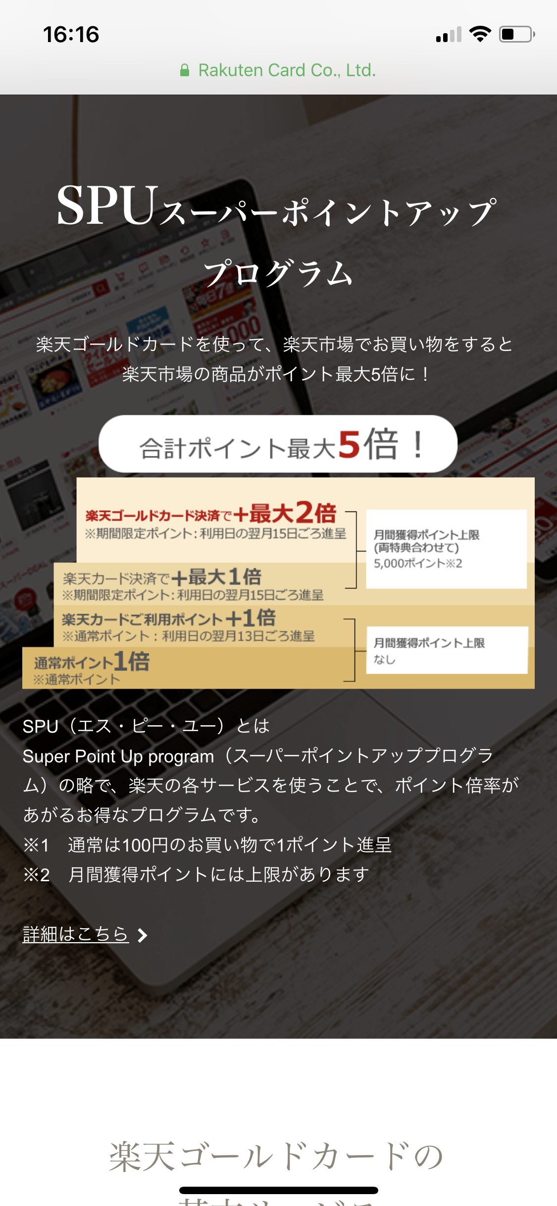 - 楽天ゴールドカードと検索して、公式ホームページを表示させる。