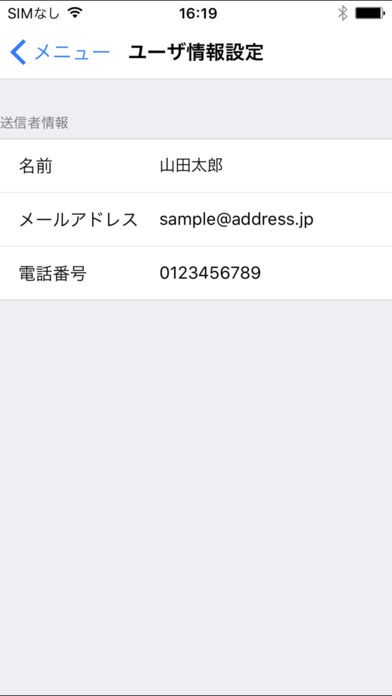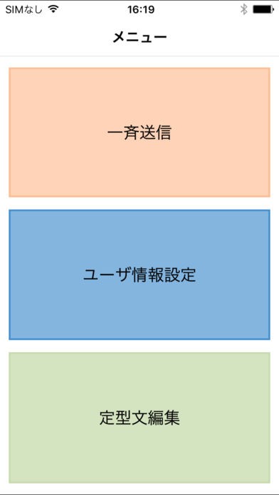 実際にこのアプリを使ってみましょう!アプリを起動すると、メインメニューが表示されます。メニューは、「一斉送信」「ユーザ情報設定」「定型文編集」の3つのみです。ボタンも大きくて分かりやすい画面です。まず、「一斉送信」メニューをタップすると、連絡先画面が現れ、通知する相手を選択することができます。一度に20人までは選択が可能です。次に「ユーザー情報設定」画面では、名前、メールアドレス、電話番号の情報を設定できます。アドレス変更情報として通知する内容になるため、間違いのないように設定するようにしましょう。「定型文編集」メニューでは、通知メールの内容を設定することができます。アプリ固定の内容ではなく、自分で決めた内容で送れるのは嬉しい機能ですよね。これも間違いのないように正確に設定するように、気をつけてください。