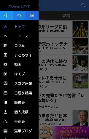 アプリを立ち上げますと名選手等の名言が見れます。その名言画面の後にメイン画面です。最初にこの画面を見た方、『こんだけ』と思うと思います。本当にシンプルすぎます。安心して下さい。上のFootBool NEXTの文字の左横に三本線のマーク、これをクリックするとトップやニュース、コラム、まとめサイ、動画、はてブ、スコア速報、日程&結果、順位表、個人成績、番組表選手のブログ、名言集と13もの項目が出てきます。こんなにも項目があることにビックリしてしまうほどです。もう他のwebに行かなくてもこのアプリ1つで全て調べられます。