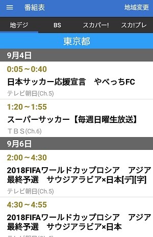 番組表は地デジ、BS、スカパー、スカ!プレで日にちと時間帯、どこの番組なんの放送が分かるようになっています。もちろん地域によって見れる番組が違ってくるので上部、番組表の文字がある場所の右側に地域変更とありますので、そこをクリックしてもらえば北海道から沖縄までの地域が書いてあります。住んでる地域に印を付けてもらえば、その地域の番組で何を放送するか?が分かり今日は、録画したい時とかに非常に役立ちます。