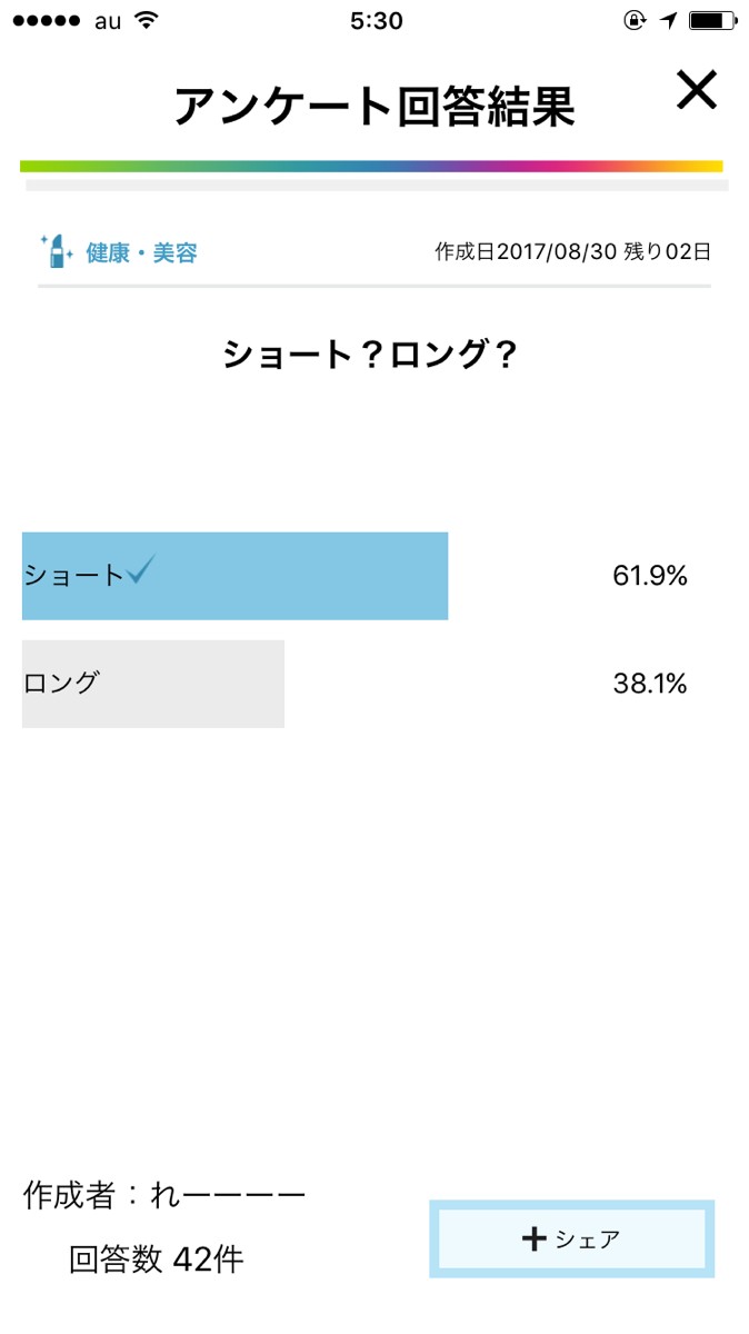 ・早速「みんなのアンケート」に答えてみます。気になるアンケートがあれば回答してみましょう。回答したあとは、現在までのアンケート結果の集計を見ることができます。結果はメールなどでシェアすることも可能です。