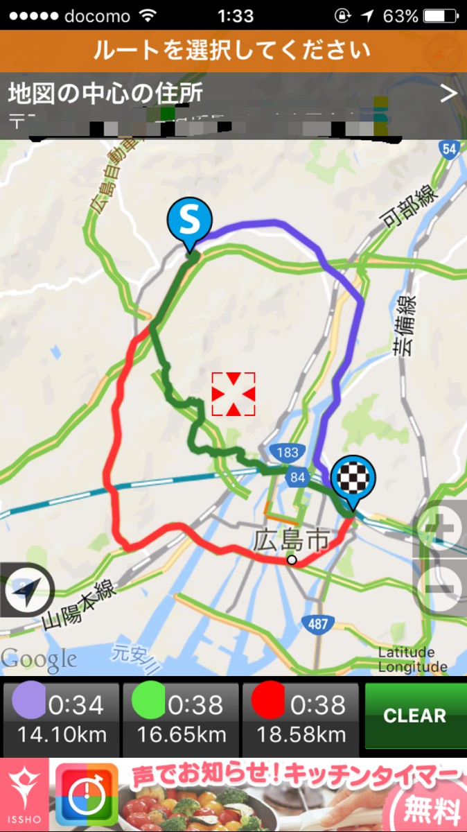 「ルート検索」をタップしたら、目的までのルートが1~3ルート表示されます。今回検索したルートは、赤、緑、紫の3つのルートが表示されました。地図上ではどんなルートを通るのかが大まかに表示され、画面下にある各色のマークには所要時間と距離が表示されています。どのルートを選択するか決まったら、画面下にある各色のマークをタップしてナビをスタートさせます。