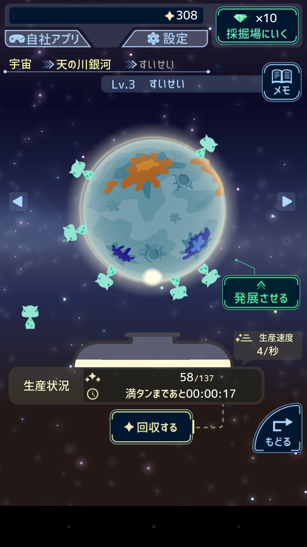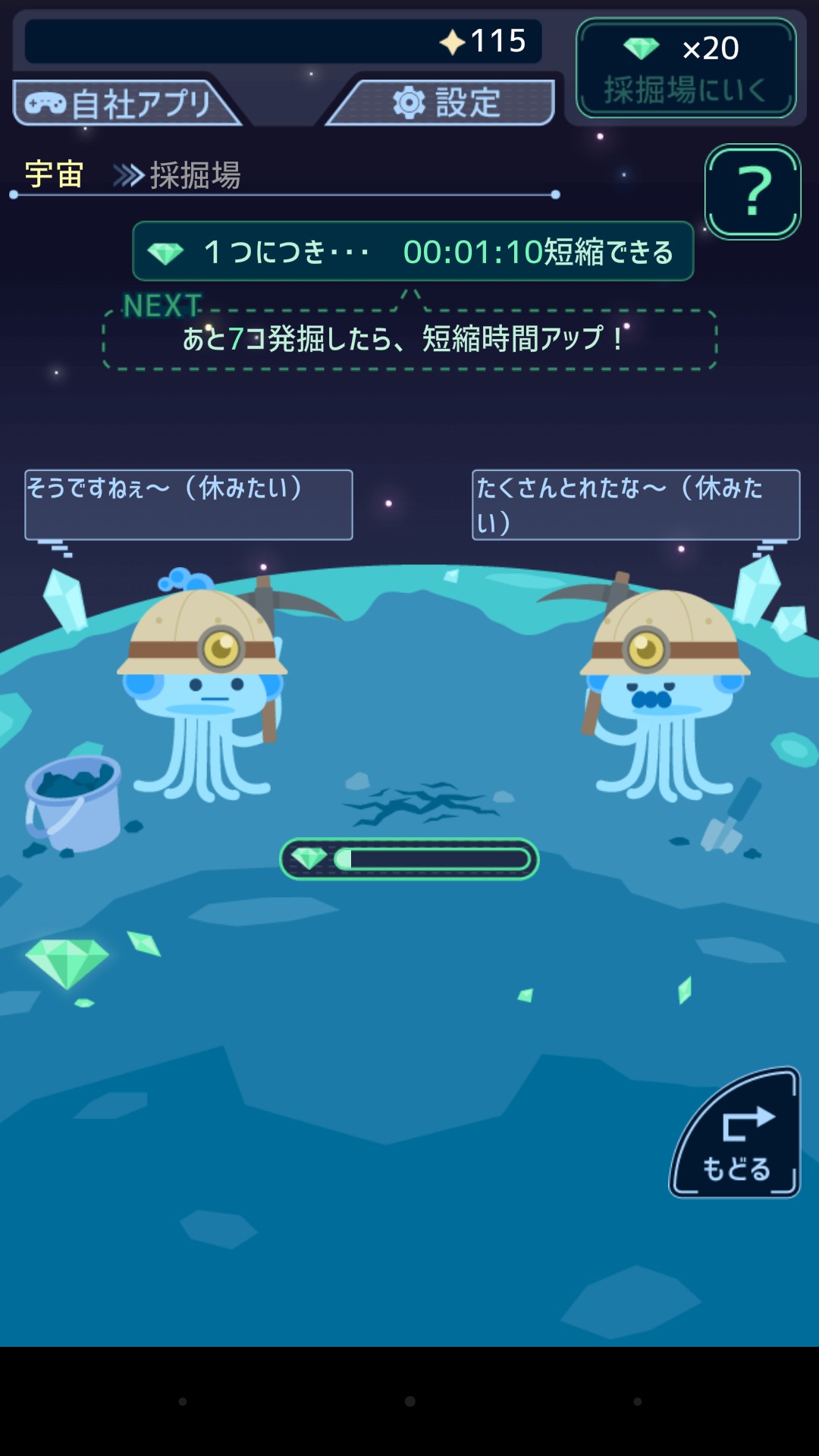 惑星発展時間の短縮に必要なダイヤを採る採掘場では、違ったBGMが流れ、ダイヤを掘る2人の宇宙人の掛け合いや採掘アニメーションが可愛くて、こちらもおすすめです。