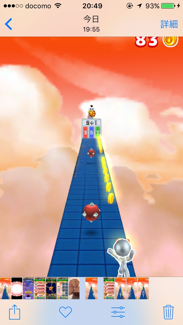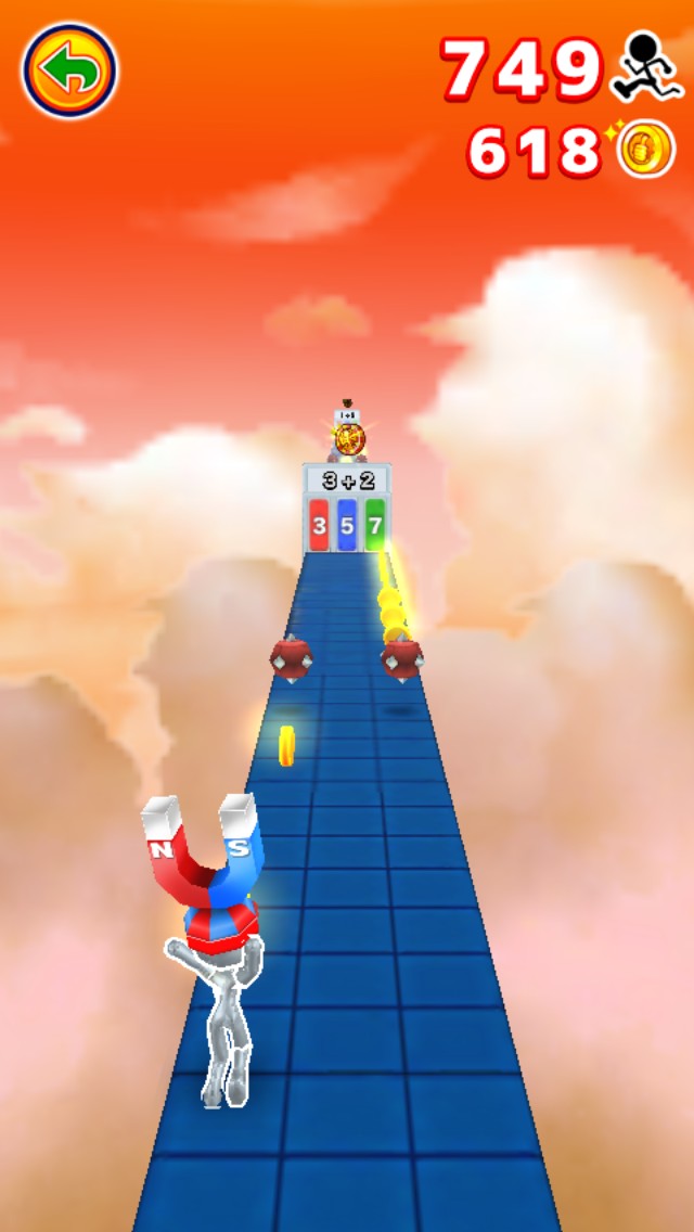 とりあえずゲームを始めると何やら主人公は得体の知れないモンスターが次々に背後から道を食べながら追ってくるのでひたすら逃げます。行く手にはトゲトゲのボールが障害物として置かれていて、コインもあります。コインを何に使うかはまだ分かりませんが、障害物に当たってはいけない気がするのでとりあえず避けつつ走ると計算パネルがあります。正解のパネルを選ぶと無事にパネルを通ることが出来ました。焦って障害物に当たったり違うパネルに当たるとその時点でゲームオーバーです。