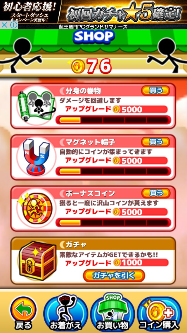 果てなく逃避行は続きますが、次第に速度は増していきます。コインを取りに行くのも追いつかなくなってきます。不用意にコインを取りに行こうとすると計算パネルに引っかかってしまいます。計算パネルだけに集中していると障害物に引っかかってしまうので、いろいろなことに気を配らなくてはなりません。コインを貯めるとゲームを有利にするアイテムを購入できるので、記録を伸ばしつつコインも取りましょう。また、コインを貯めるとガチャが引けます。ガチャを引くと主人公のアクセサリーなどがゲットできます。普通にプレイしていればすぐにガチャが引けるくらいはコインが貯まります。着せ替えするとまた新鮮に見えるのでおもしろいです。どんなアクセサリーにしても慌てふためき逃げ続ける姿がかわいいです。