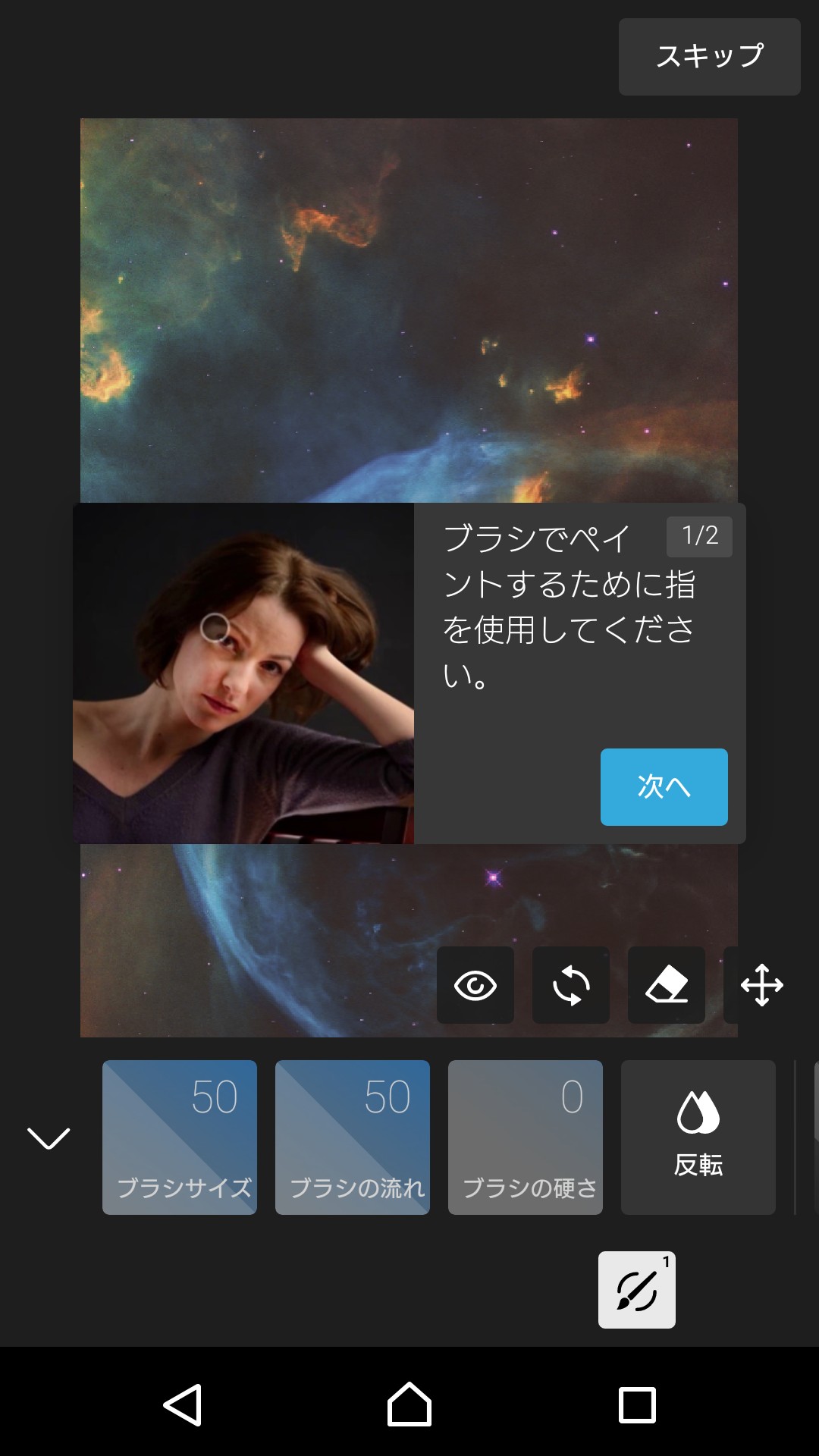 すぐに編集画面に切り替わります。自動調整機能もありますよ。ブラシで磨きたい場合は、ブラシのマークをタップします。ブラシサイズ、ブラシの流れ、ブラシの硬さまで、自由に設定できます。さすがプロ仕様ですね。慣れるとすぐに加工できそうです。編集できる項目が多彩なので、マークと加工できることが結びつくまでは、サンプルの使用がオススメです。すいすい操作できるようになれば、手放せくなるなりそうなアプリです。