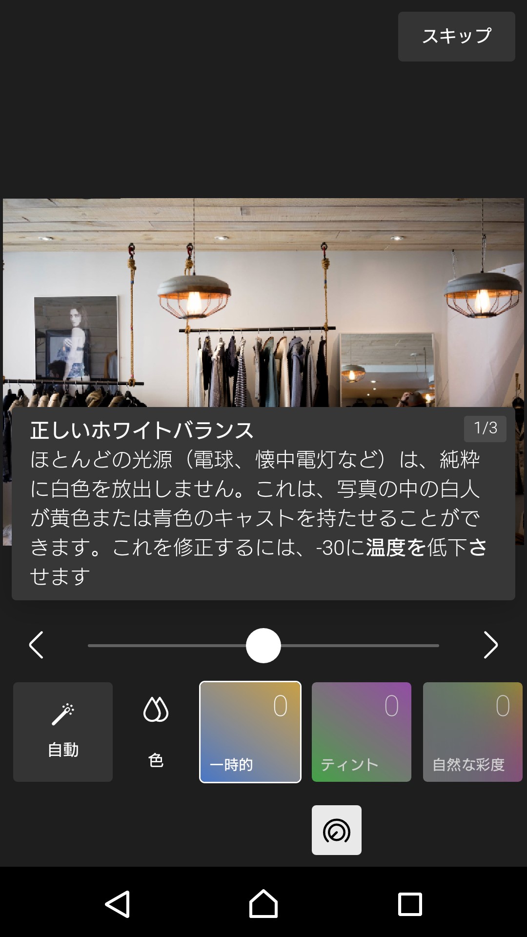 本格的なアプリなので、どのように写真が加工されて行くのか工程が勉強できます。意味の分からない加工機能も画面上に、例えば「ホワイトバランスを学ぶ」など、説明が開けるので理解できます。