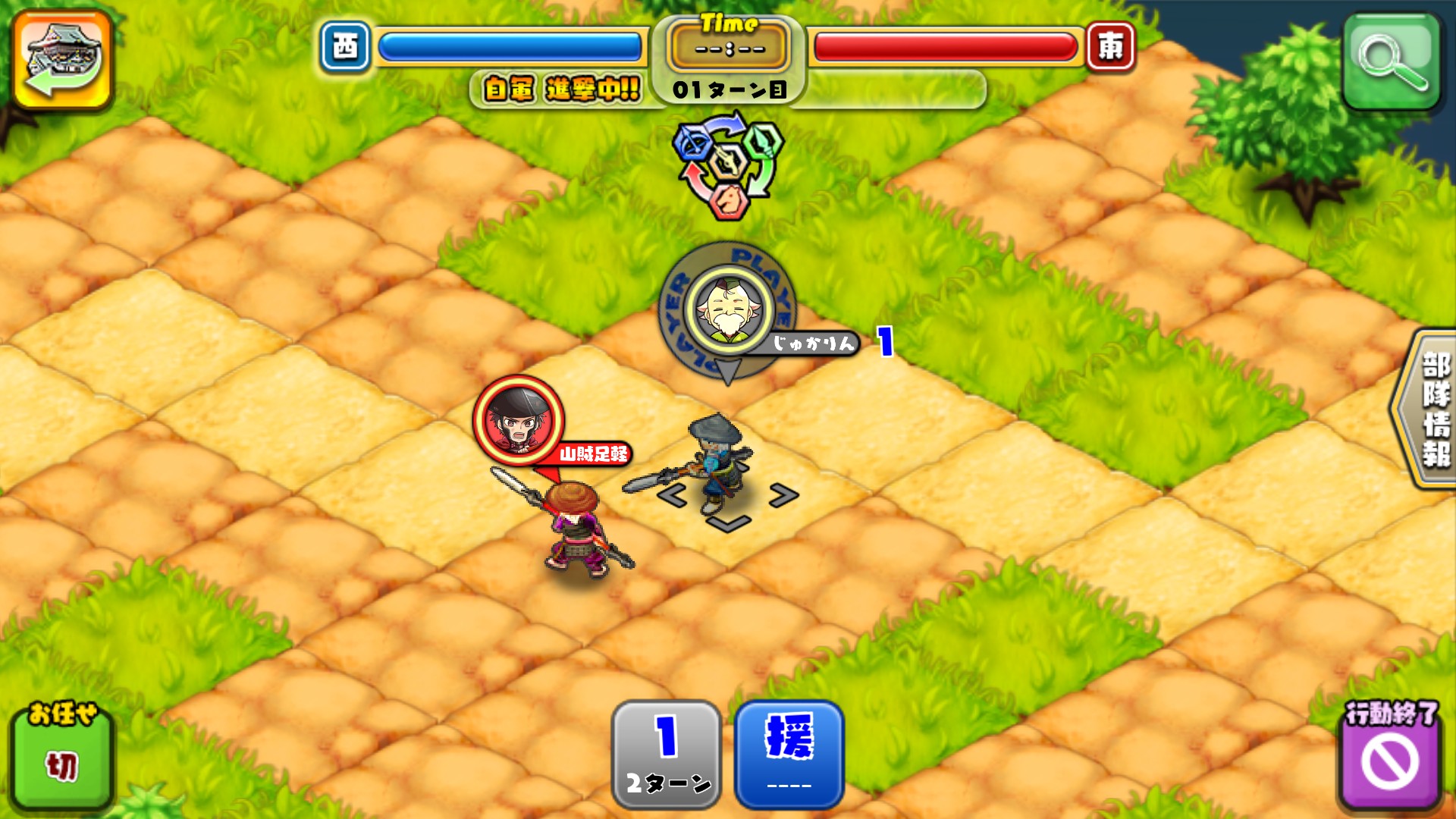 もう一つのメインは合戦です。こちらはプレイヤー同士の多人数対戦で、マス目上のフィールドを部隊が動き敵軍を撃破することを目的とします。