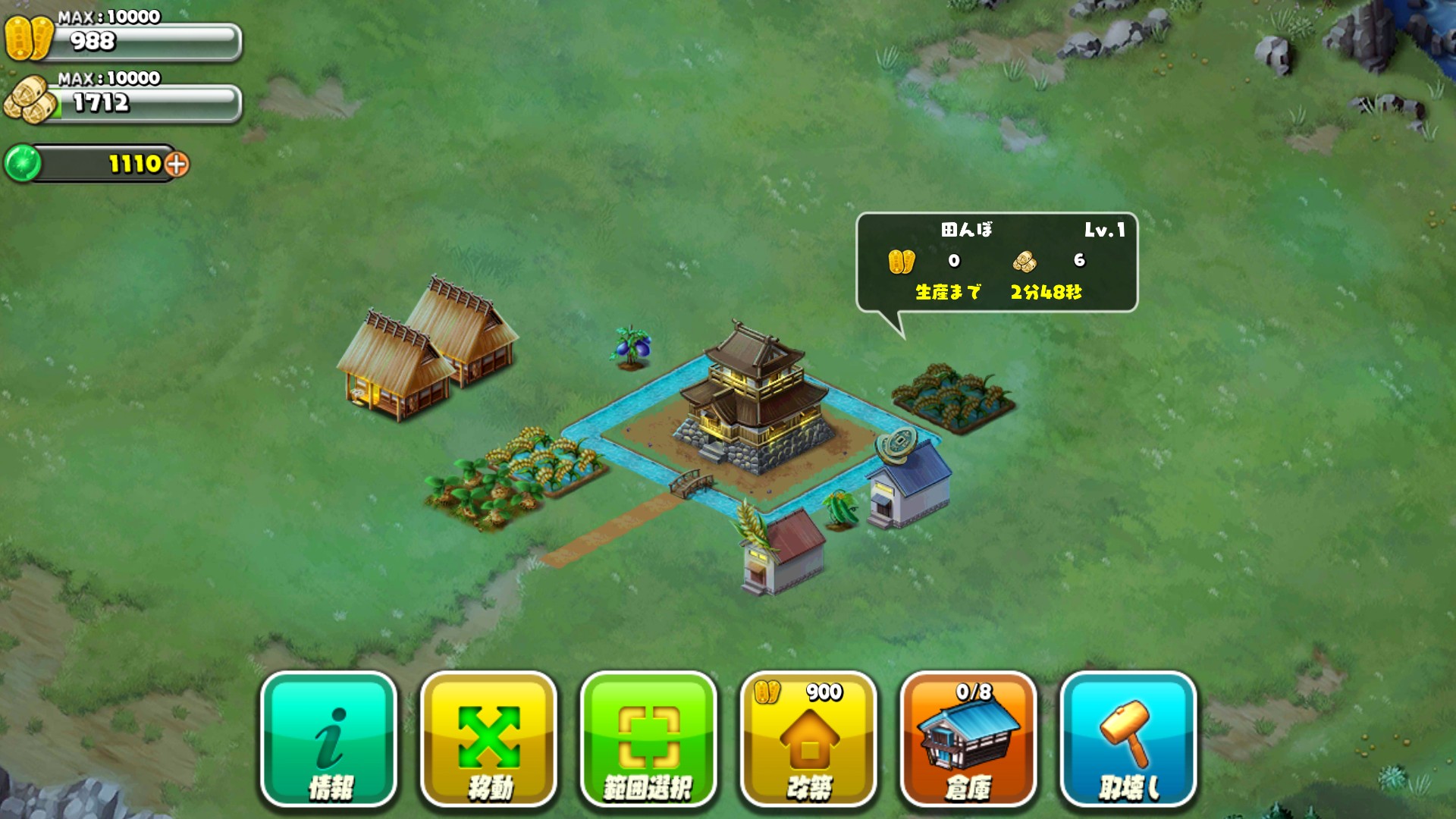 最初は爺と一緒に街づくりを学んでいくことになります。最初に田んぼを設置しましょう。このゲームの資源は「両(お金)」と「糧(食糧)」の二つで両は主に施設の建築に使い、