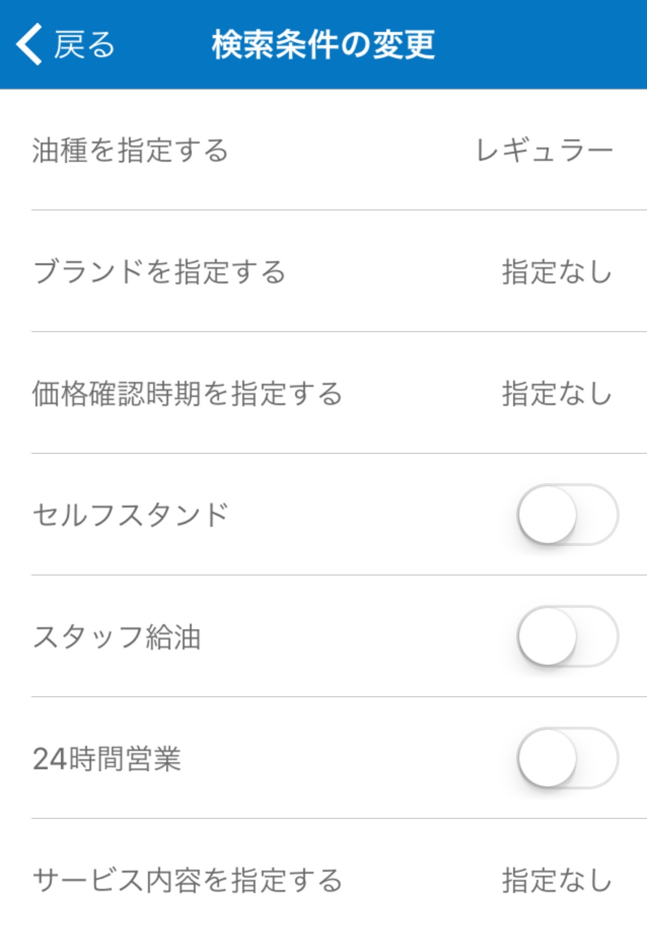 メイン画面上部にある「条件変更」ボタンをタップすると、油種、ブランド、価格確認時期、セルフ給油、スタッフ給油、24時間営業、サービス(洗車、車検、板金、オイル交換、タイヤ交換、レンタカー、カフェ併設、コンビニ併設)、灯油限定店で詳細検索を行えます。
