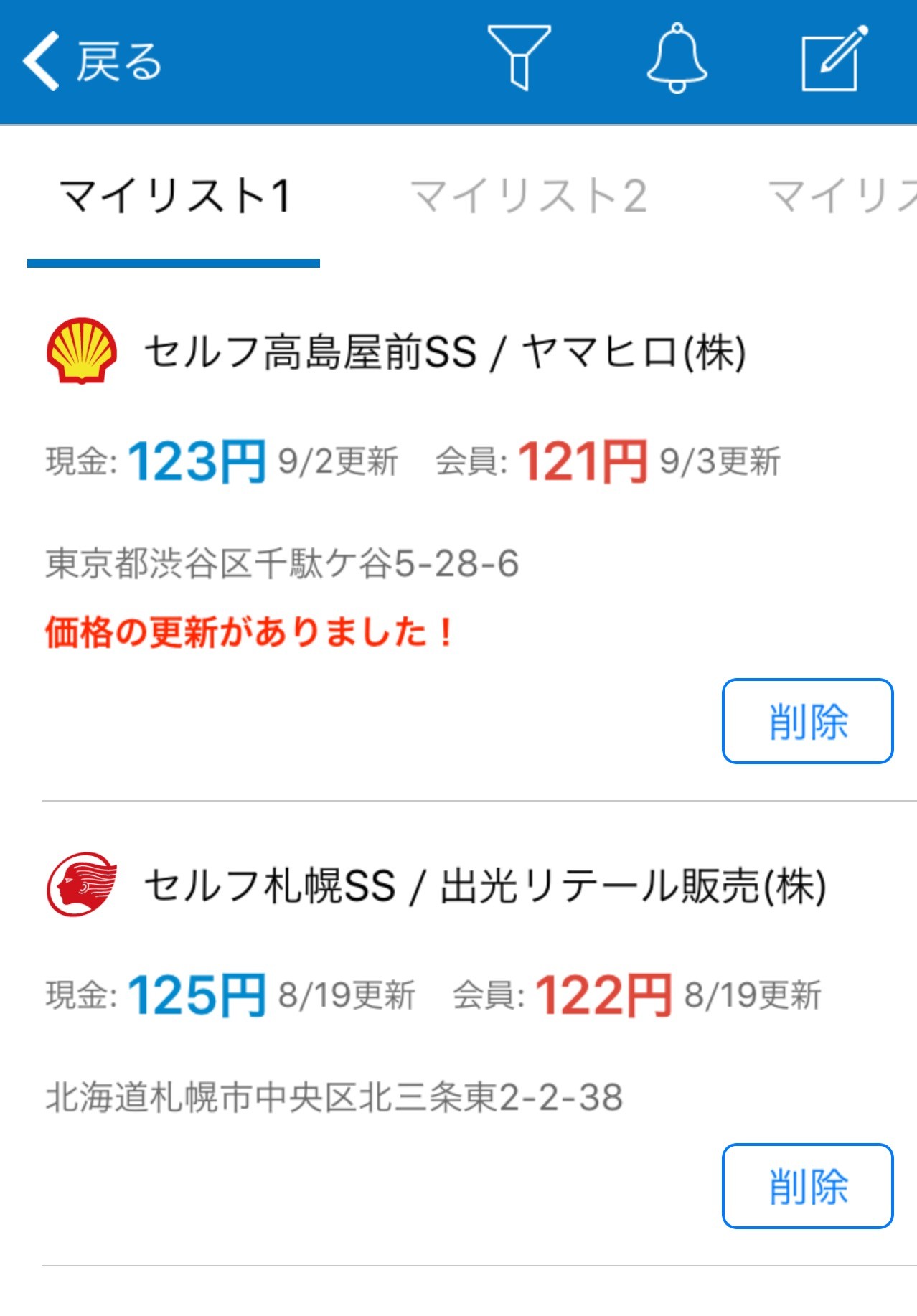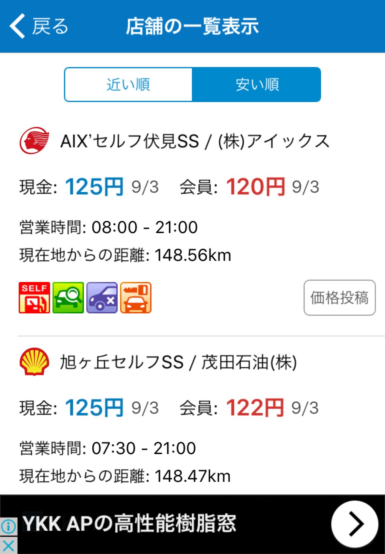 リストには、現金価格。会員価格、営業時間、現在地からの距離など、スタンド選びに役立つ情報がまとめられています。