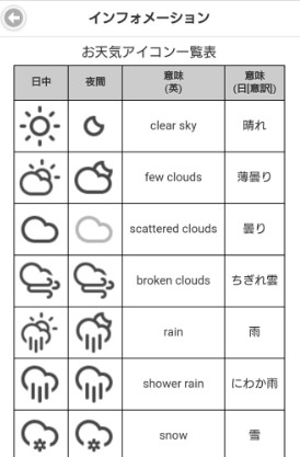 天気予報の下に表示された、メニューアイコンの内容は次のとおりです。