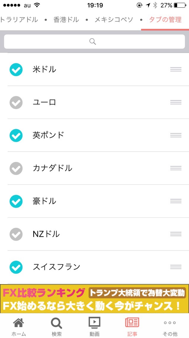 FXに関する記事、動画ともにタブを編集することができます。表示したいジャンルだけを選択しておけば、より情報が見やすくなります。