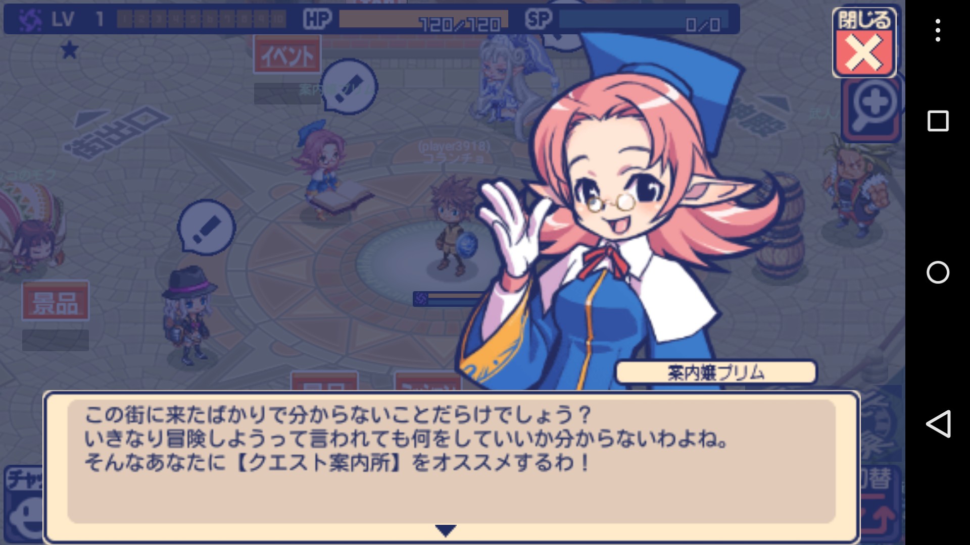 ルームを作ればいよいよ街降り立ちます。行きたい場所をタップすると自動で移動するので、まずは案内嬢からチュートリアルクエストを受けましょう。