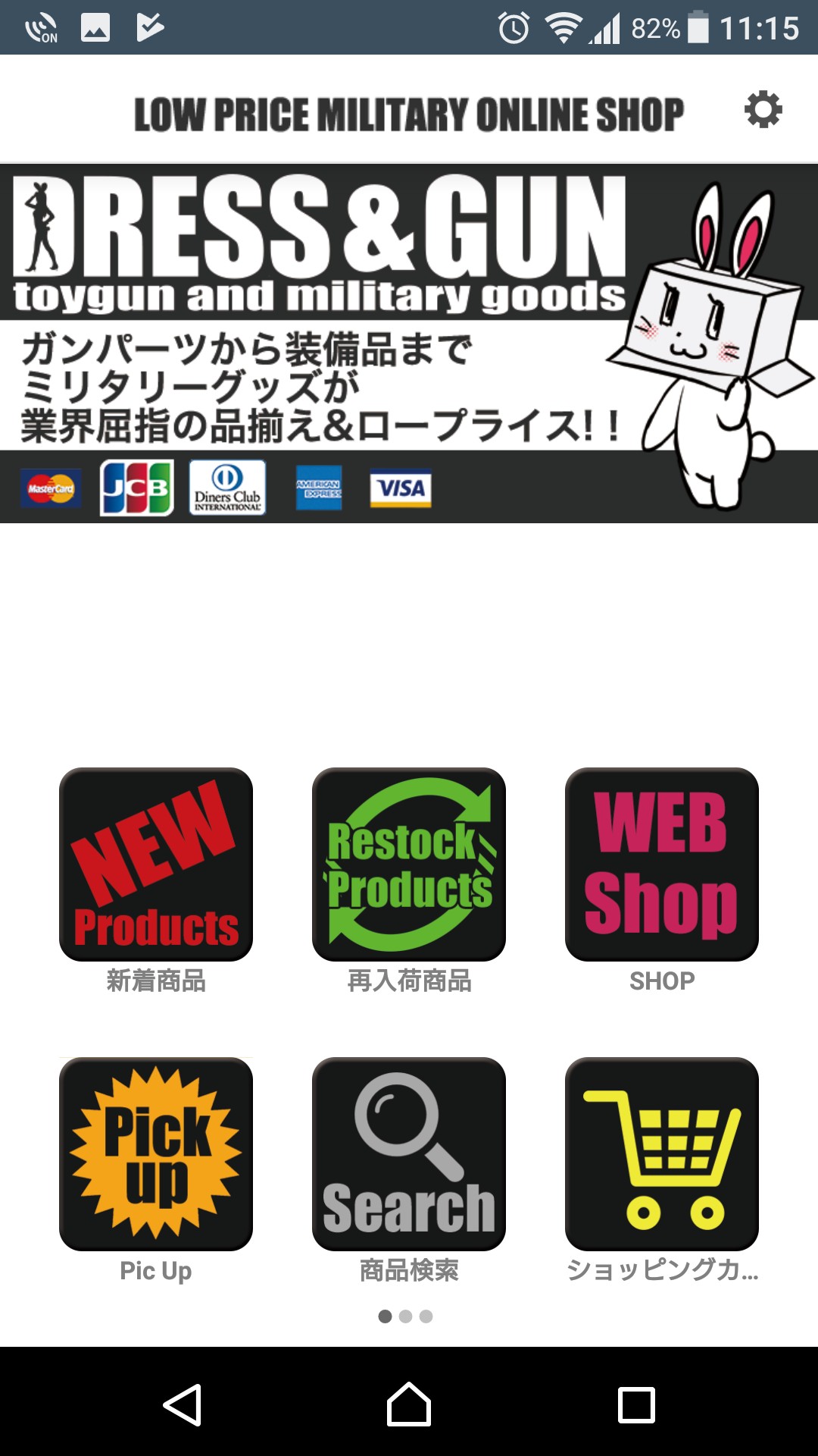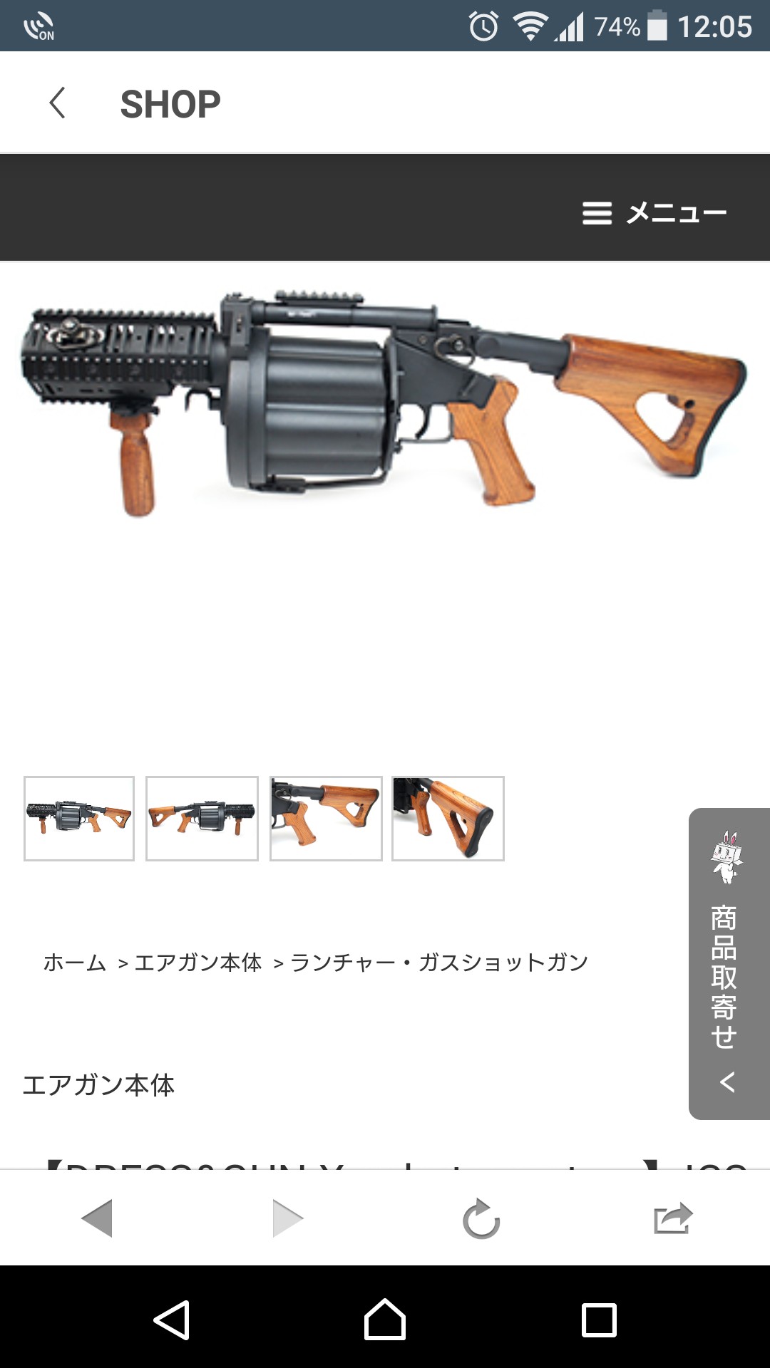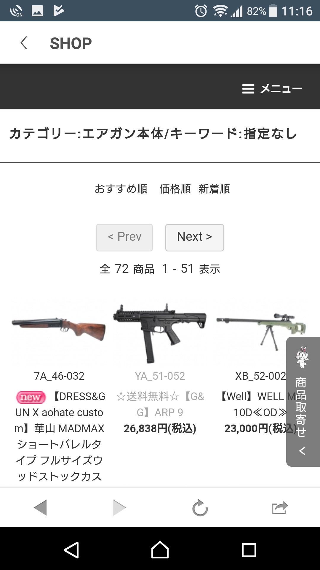 まずは「SHOP」について解説します。商品が多数並んでいますので、上のスクリーンショットでは、「カテゴリーを選択」をタップして商品を「エアガン本体」に絞って選んでいます。その結果として72商品という多数のアイテムが検索にかかりました。試しにアイテムをひとつタップしてみると、詳細な商品写真と商品説明文が表示されました。購入したい商品であればここからカートに入れ、購入の手続きをすることができます。銀行振込、代引き、各種クレジットカードでの支払いに対応しています。商品は名前でダイレクトに検索することも可能です。