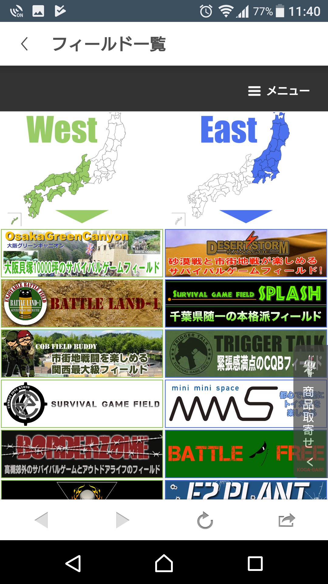 「フィールド一覧」をタップすると、サバゲーがプレイできるフィールドの一覧が表示されます。フィールドの詳細や料金を確認することができる他、ここからフィールドの予約が可能です。ショップで装備を整えすぐフィールドの予約ができるとなると、当日に向けてのテンションが上がっていくことでしょう。