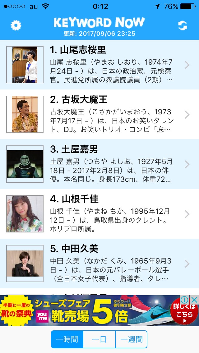 アプリを起動すると、画面上に最新のキーワードランキングが表示されます。画面上部に更新日時が表示されますよ。画面右上の矢印ボタンをタップすると、情報が更新されます。画面下部の「一時間」、「一日」、「一週間」をタップして、期間ごとのランキングをチェックしてみましょう。