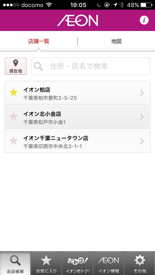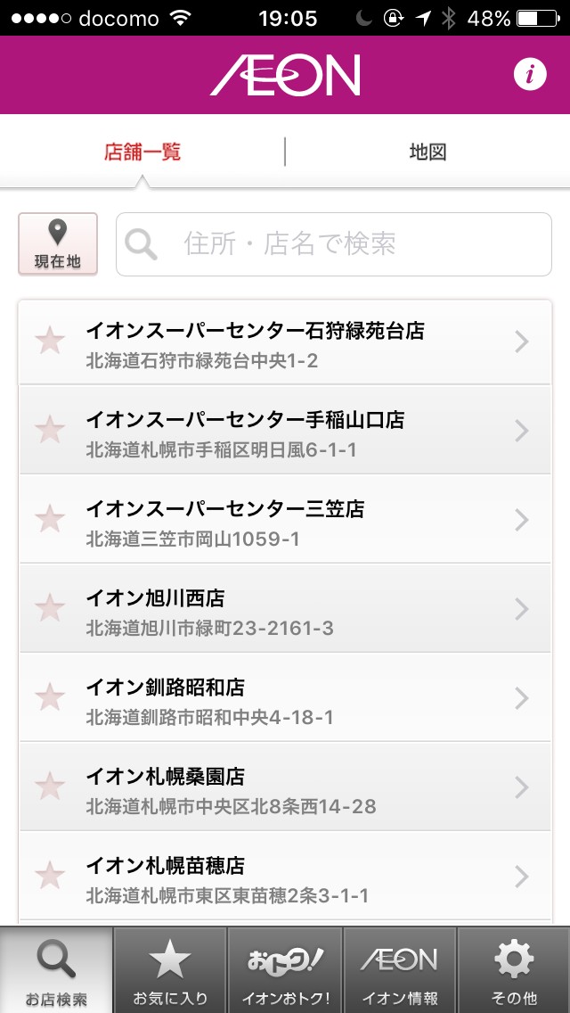 一つ目のおすすめポイントは位置情報から店舗をピックアップできる点です。先ほど説明したように、この「イオンチラシアプリ」はスマートフォンの位置情報システムを利用することでお近くの店舗を自動検索することが可能です!いちいちネットで検索する必要がないのは便利ですね。二つ目のおすすめポイントはお気に入りの店舗を登録することで、その店舗に関するピンポイントなお買い得情報(チラシやミニチラなど)を入手できる点です。毎回店舗を検索していたら面倒ですから、お気に入りに登録しておける機能は非常に重要です。三つ目のおすすめポイントはお気に入りに複数の店舗を登録しておけるというところです。店舗ごとに商品の値段を比較したい人などには大変便利ですね!
