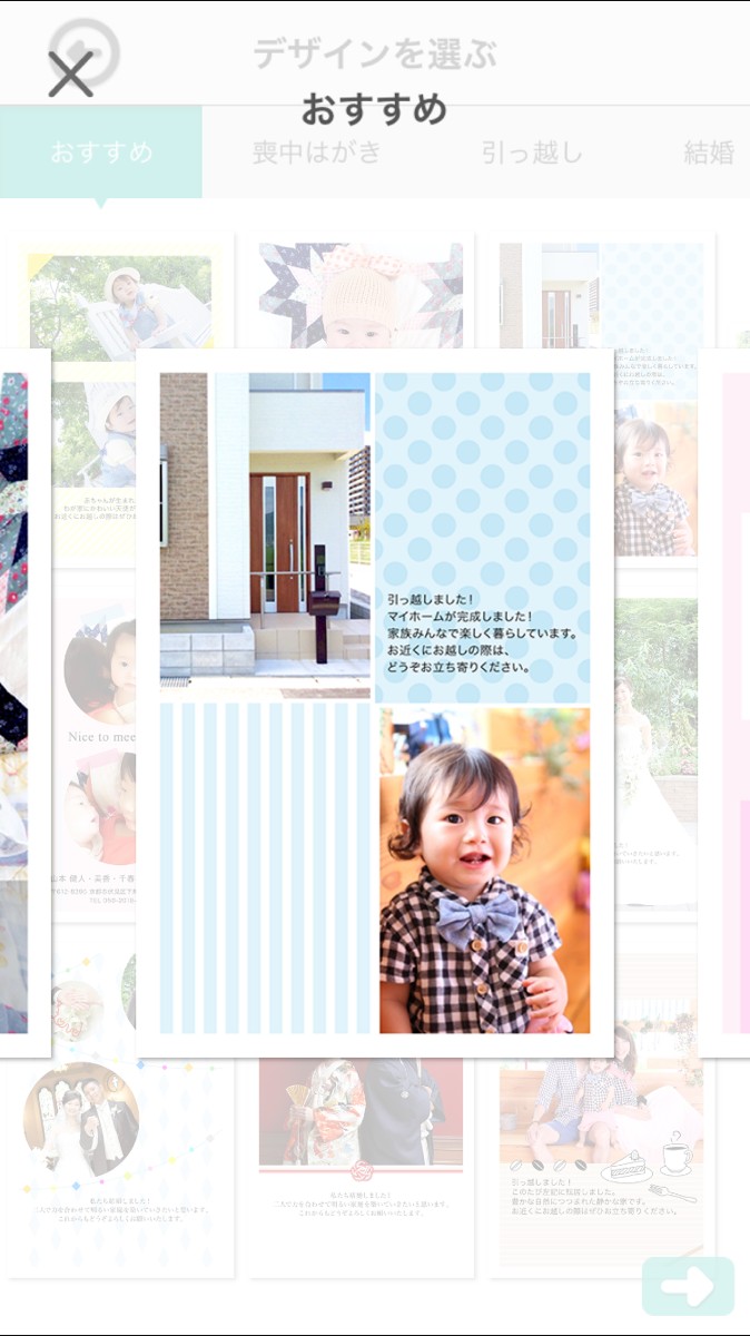 「かんたんポスカ|挨拶状やポストカードを簡単作成」は、喪中はがきや引っ越し、結婚、出産など、様々な場面でのポストカードを作成できます。200種類以上ある豊富なデザインの中から、テンプレートを選ぶだけなので作成も簡単で、きっと気に入ったデザインが見つかるでしょう。決まったデザインの中から選ぶ以外にも、スマホの写真を使って作成することもできます。自分で文字やスタンプを追加すると、オリジナル感溢れるポストカードになります。