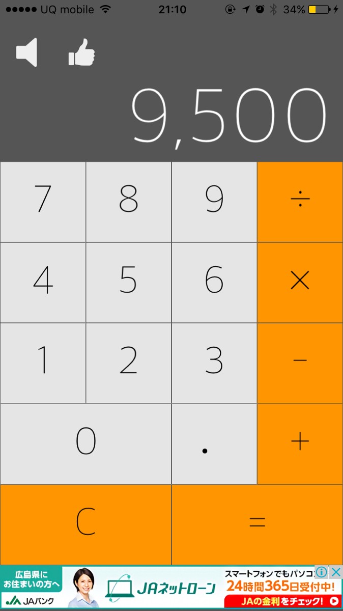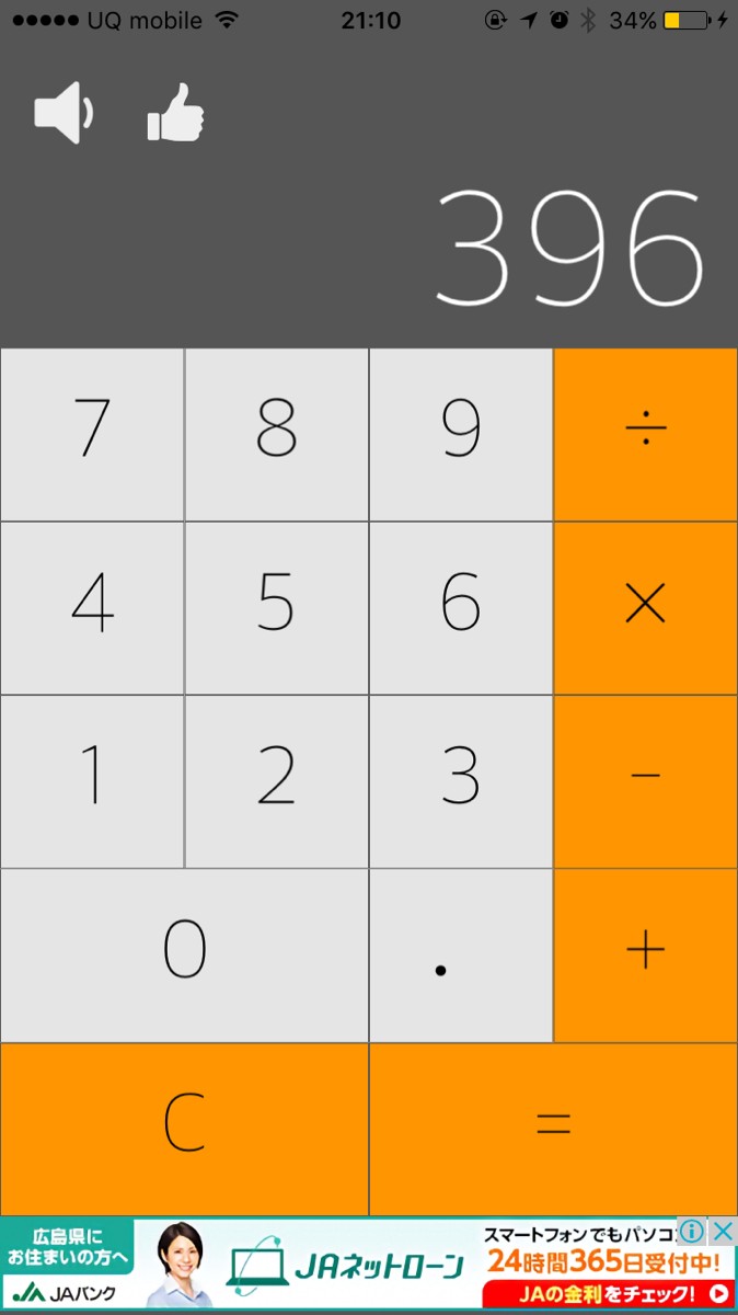 iPhoneユーザーなら見覚えのあるこのデザイン…。そう、これはiPhoneに搭載されている電卓によく似た電卓アプリなのです。機能は通常の電卓と一緒で、ひと通りの計算が可能です。