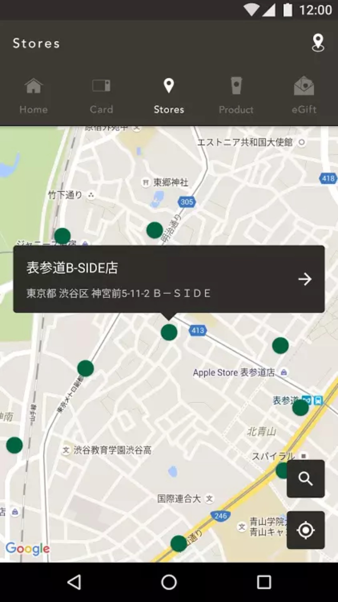 スターバックスジャパン公式モバイルアプリでは、GPS昨日を使うことで近くのお店が検索できます。