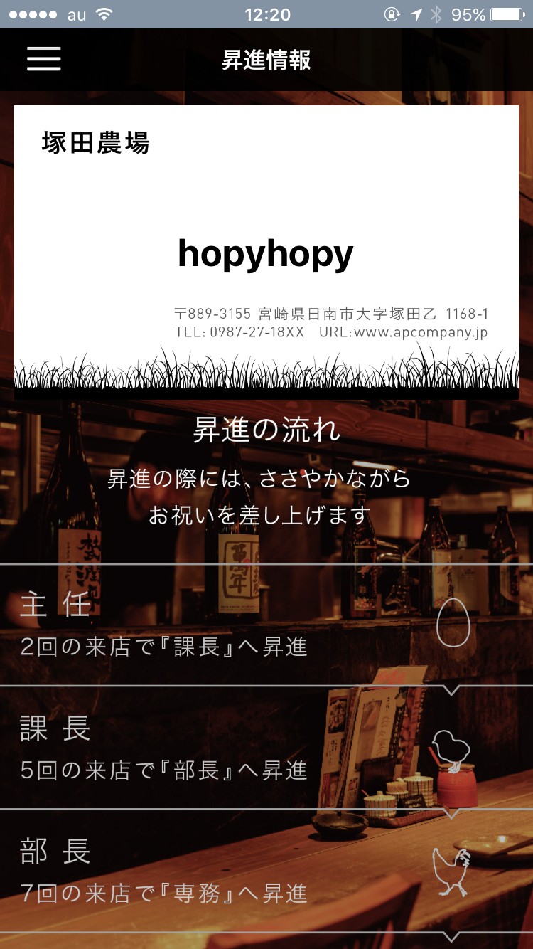 来店1回で「主任」、2回目の来店で「課長」、5回目の来店で「部長」と、どんどん昇進していくのです。