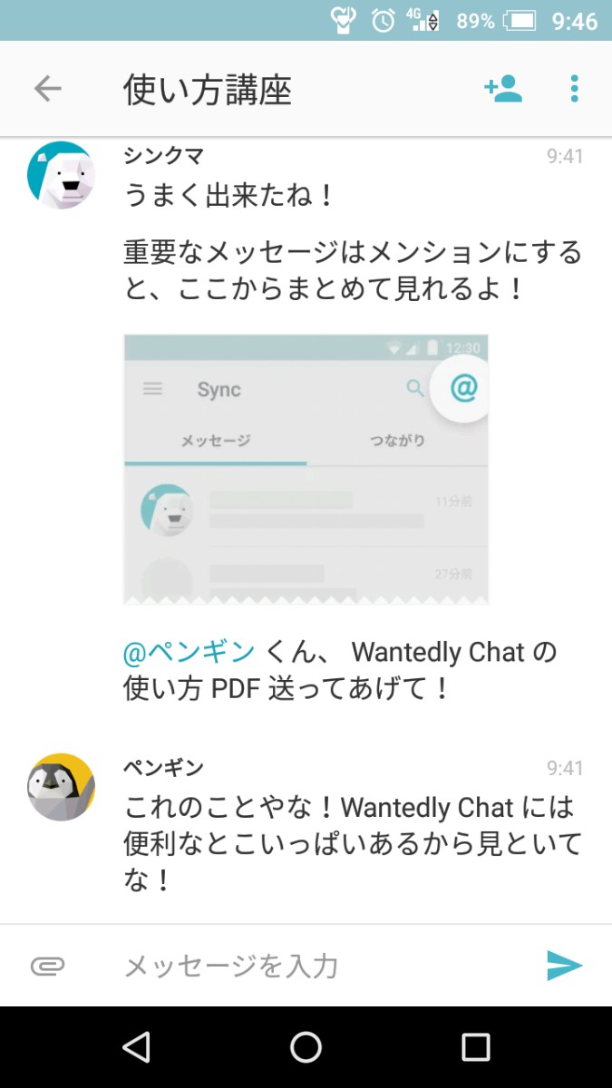 ・登録が終了すると、メッセージ画面にシロクマのアイコンに「使い方講座」というチャットルームが表示されるので、タップして入ります。