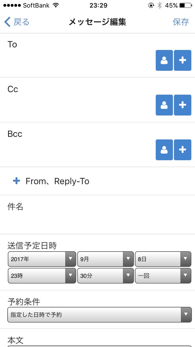 2.メールを予約送信するには、右上の「+」ボタンを押して新規作成しましょう。宛先や件名、本文は通常のメールと同じです。「送信予定日時」や「予約条件」も必ず設定しましょう。「予約送信日時」は年月日と時間、送信間隔を選びます。一度だけ送信するのはもちろん、毎時、毎日、毎週から最長で毎年まで設定可能です。