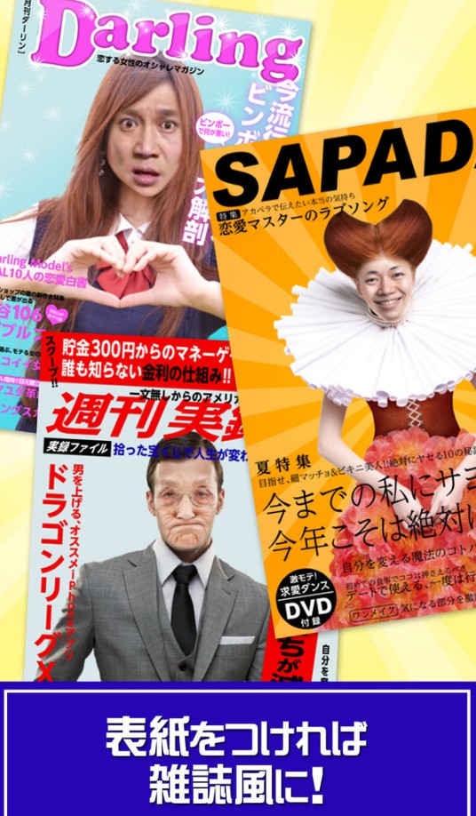 「顔出しカメラ」は、顔をハメ込むだけで雑誌のような面白合成画像が作れるアプリです。タップ操作はわずか3ステップの簡単作業で面白画像が完成します。好きなキャラクターに顔をハメたら、その画像に雑誌風の文字をつけるだけで偽雑誌風のコラージュ画像が出来上がります。エフェクトキャラクターや文字が面白く、既存の設定だけでも笑えるものが多いのが特徴です。