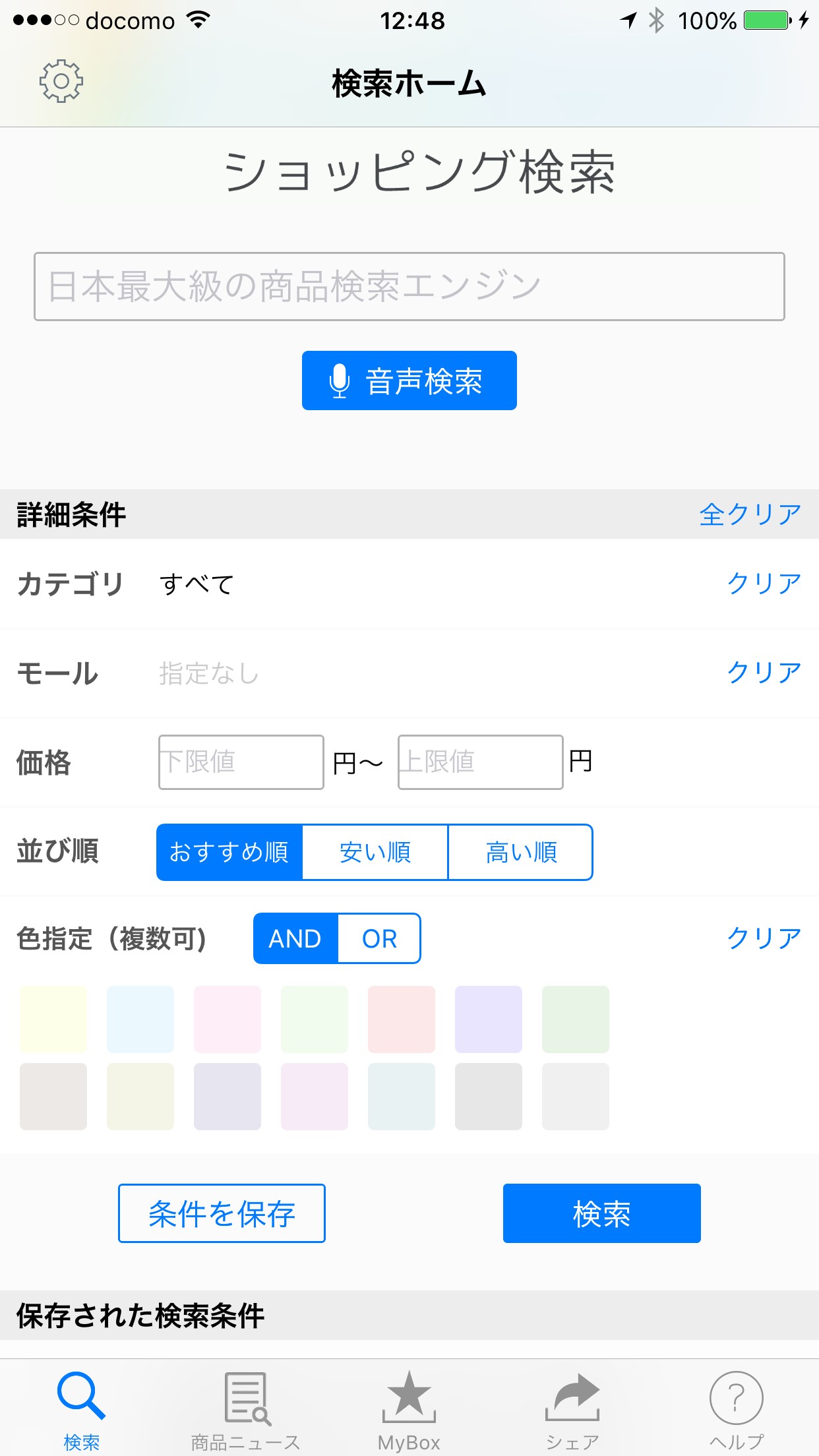 商品を探す際には、キーワードの入力や、価格の下限・上限の設定、色の指定を行うだけでなく、楽天やYahoo、Amazonなどのショッピングサイトを指定して探すこともできます。