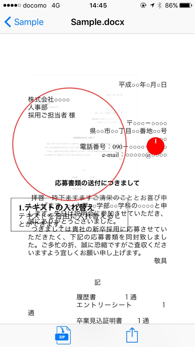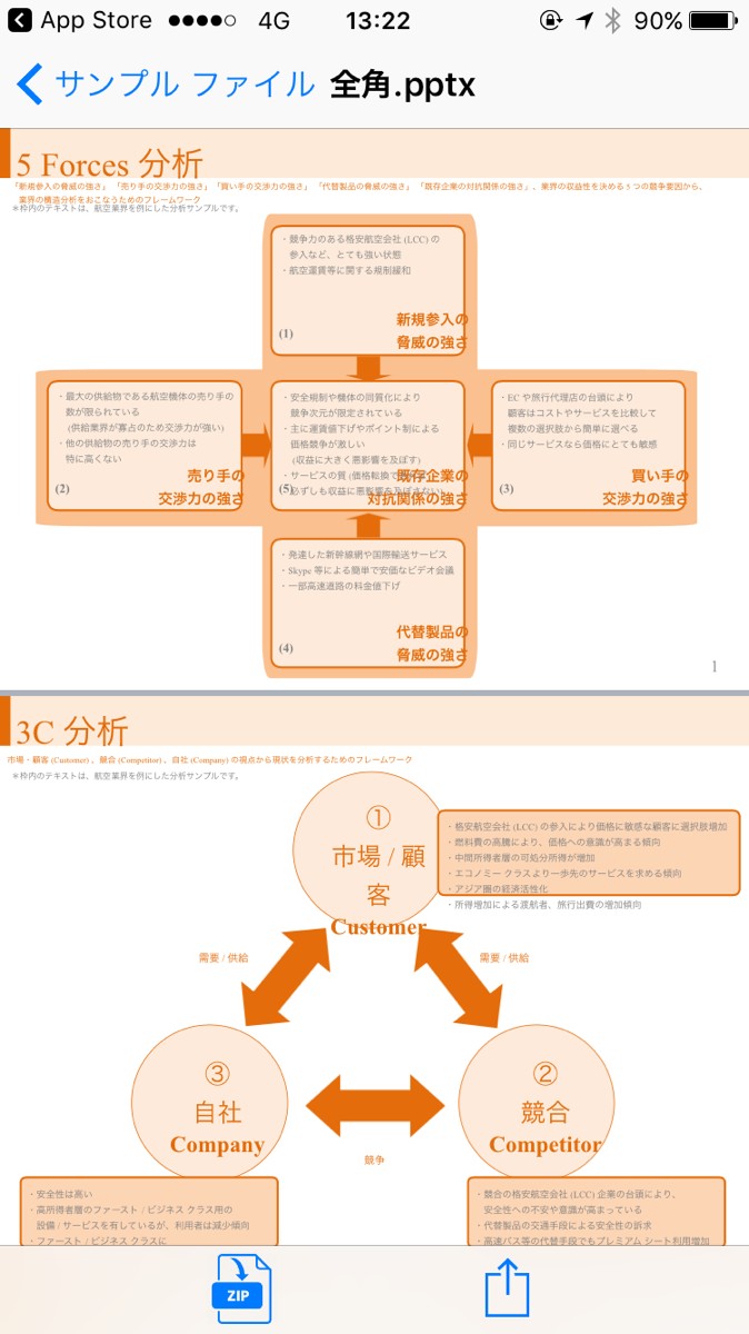 解凍したファイルは、アプリ内からプレビュー表示させて閲覧することができます。PowerPointoやWordもこのアプリがあれば携帯画面で確認できるのは便利ですね。