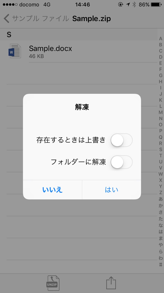 3.「フォルダに解凍」のタスクバーをオンにして「はい」をタップ