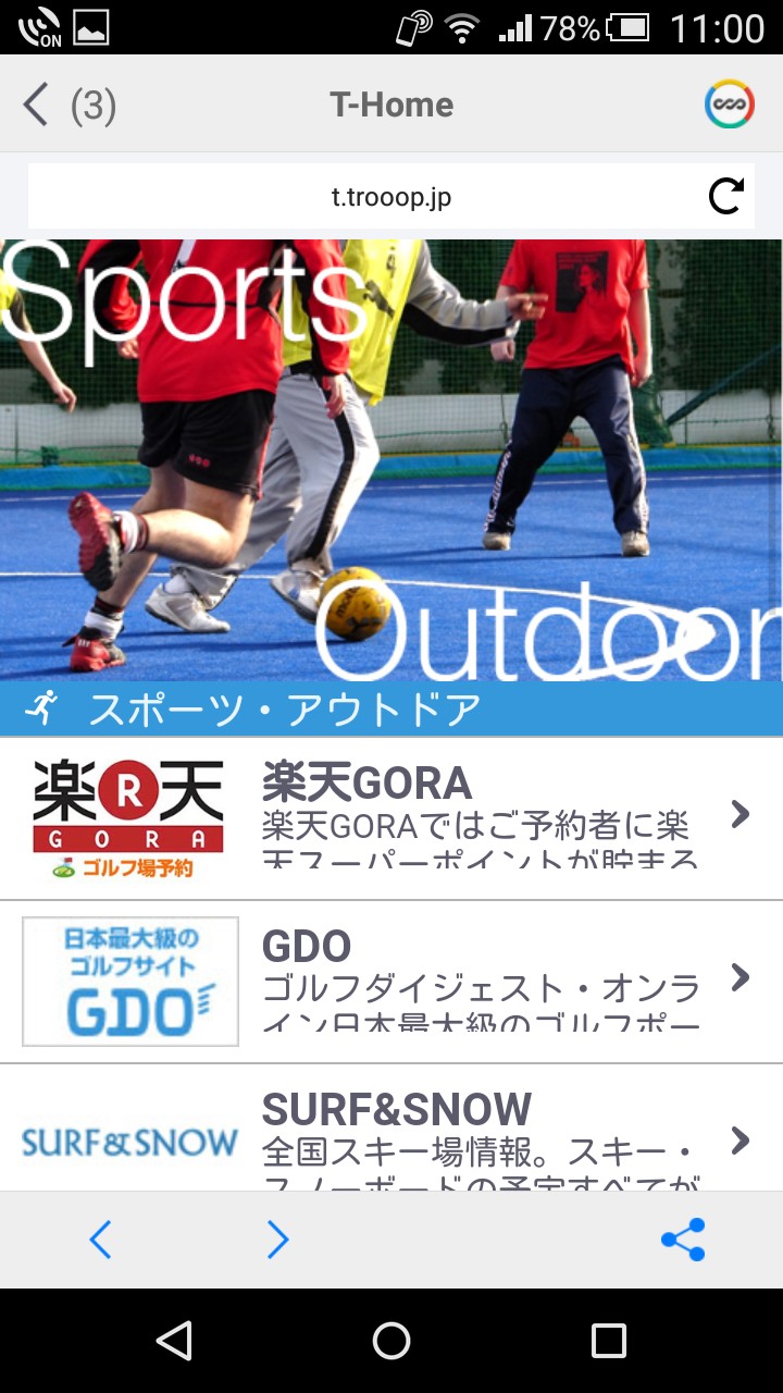 T-Homeをタップすると、トラベル、グルメ、スポーツ、マップ、ファイルや写真の共有などのサイトが分類して表示され、グループで共有したいサイトを探してトークに送信できます。