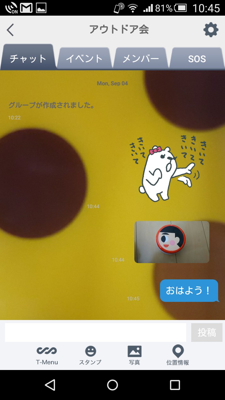 「Trooop」の便利な機能は、何といってもイベントとSOSです。加入しているグループの画面を開くと、上にチャット、イベント、メンバー、SOSのタブがるので、トークに埋もれず、すぐに見ることができます。
