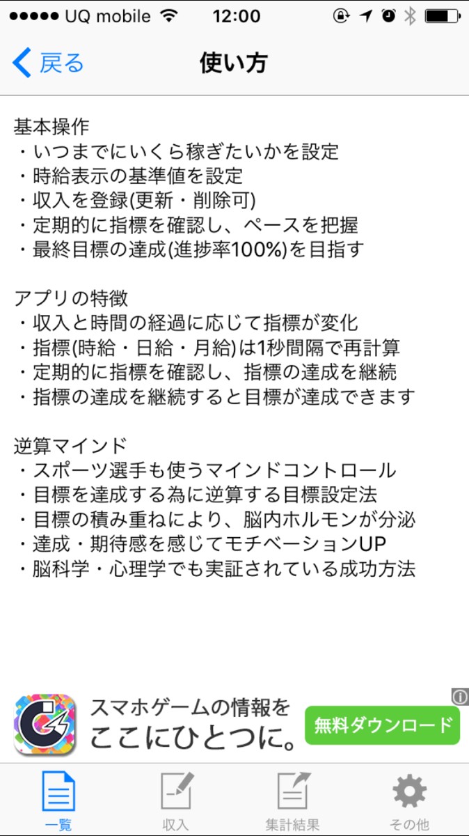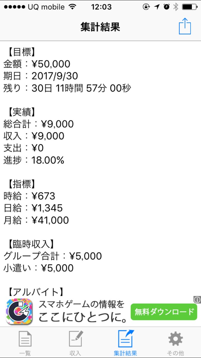 シンプルな操作性で、収入項目入力の自由度が高く、使いやすいアプリだと思います。まず、目標金額と達成期日を入力。収入があった場合に、自由度の高い入力画面でグループ分けやタイトルと共に収入の入力が可能。様々な種類の収入がある場合に便利に使えます。一日に稼ぐべき金額が、日給や時給に計算され具体的に表示されるので、日々稼ぐべき金額が見えて身が引き締まります。